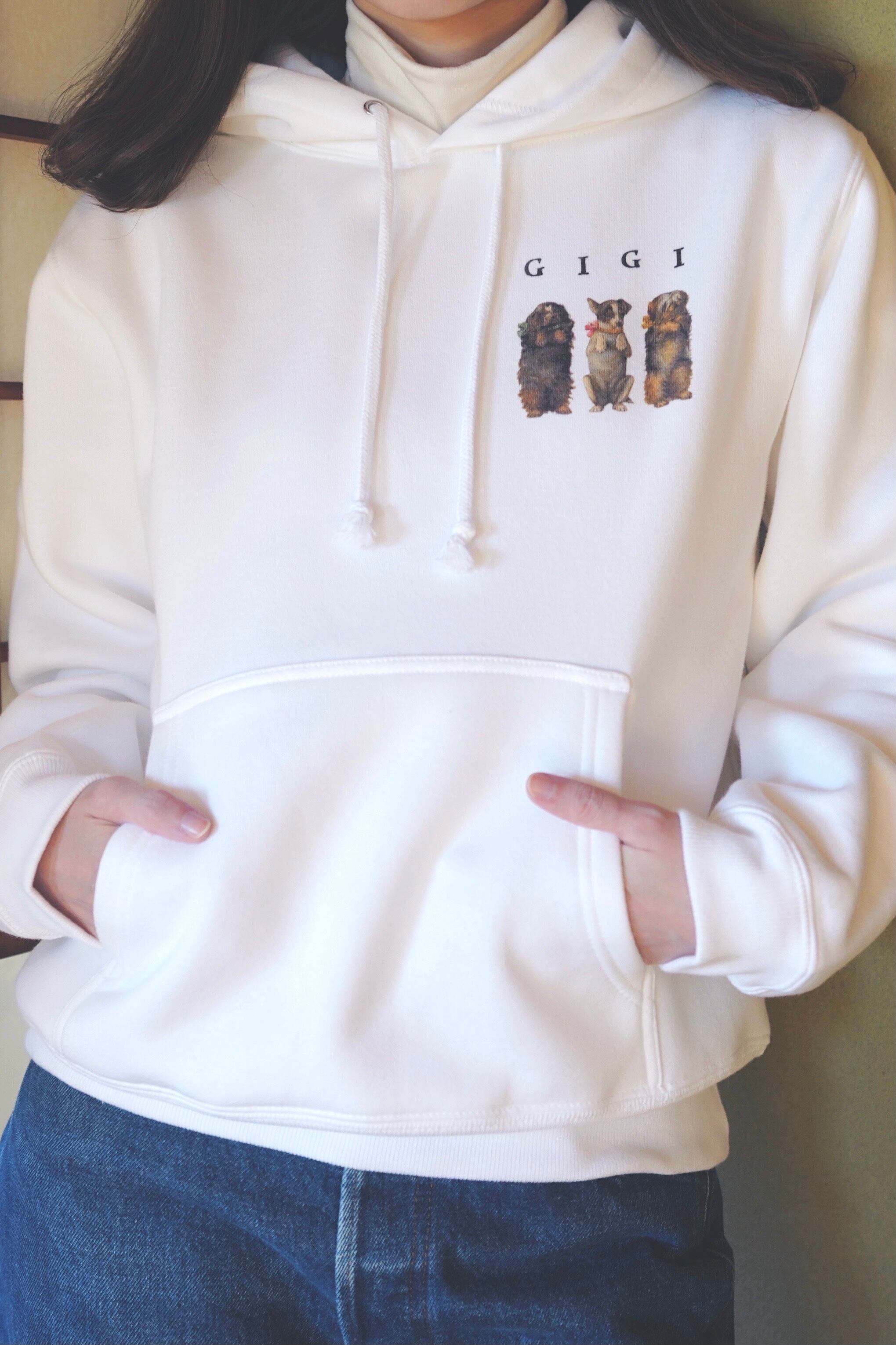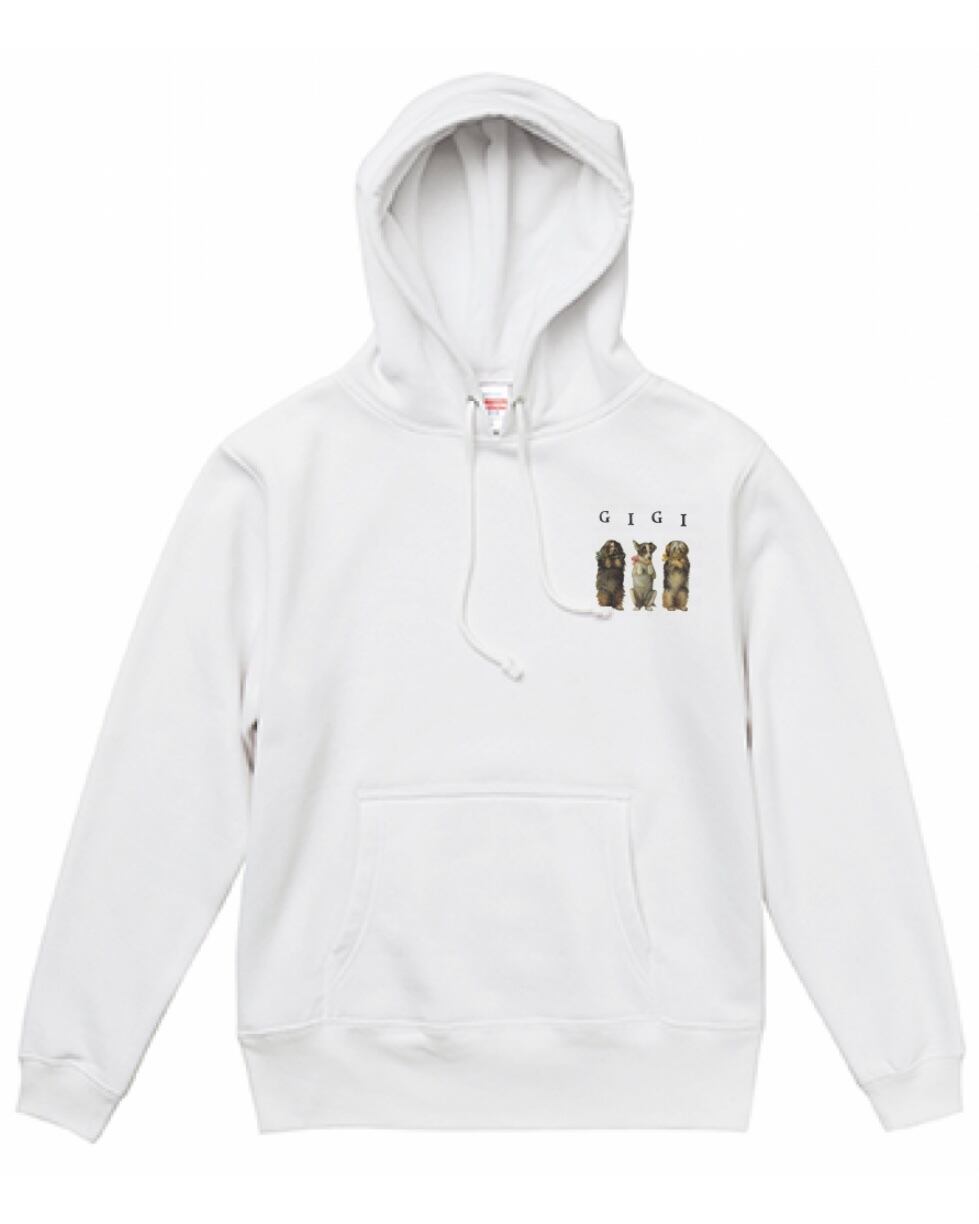 gigiから初めてのオリジナルグッズを発売。裏起毛の暖かな、スウェットプルオーバーパーカーです。ワンちゃん好きにはたまらないプリントデザインとなっております。gigiのハンドメイドニットアイテムとの相性も抜群です。