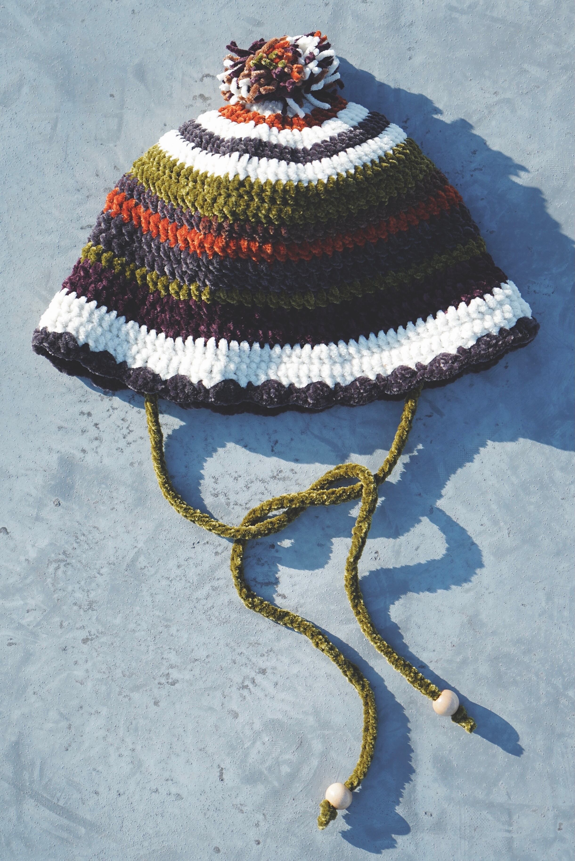 光沢感のあるモール糸をボディに使用したクロッシェです。合わせるコーディネートを選ばない、すっきりとしたシルエットに仕上げました。