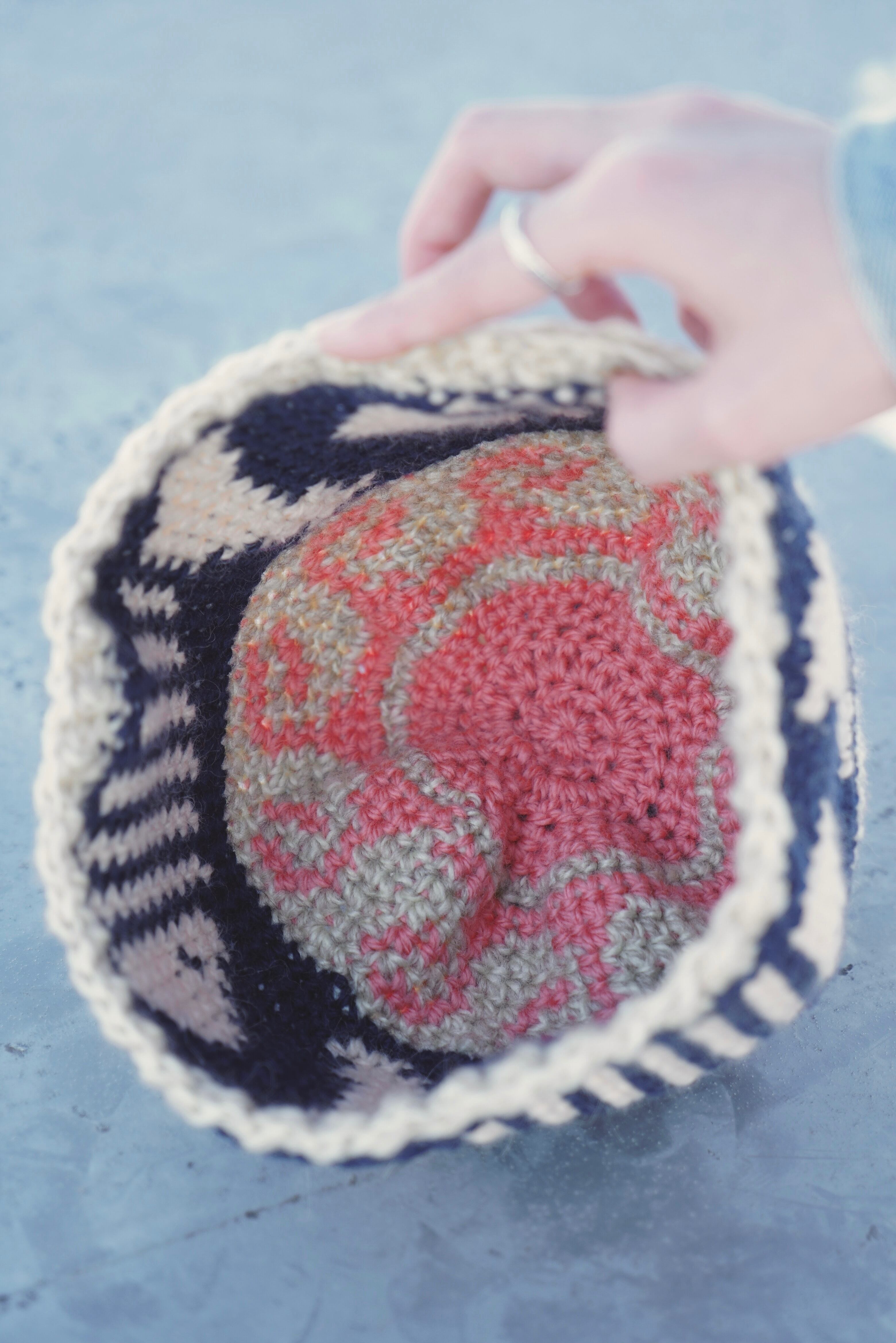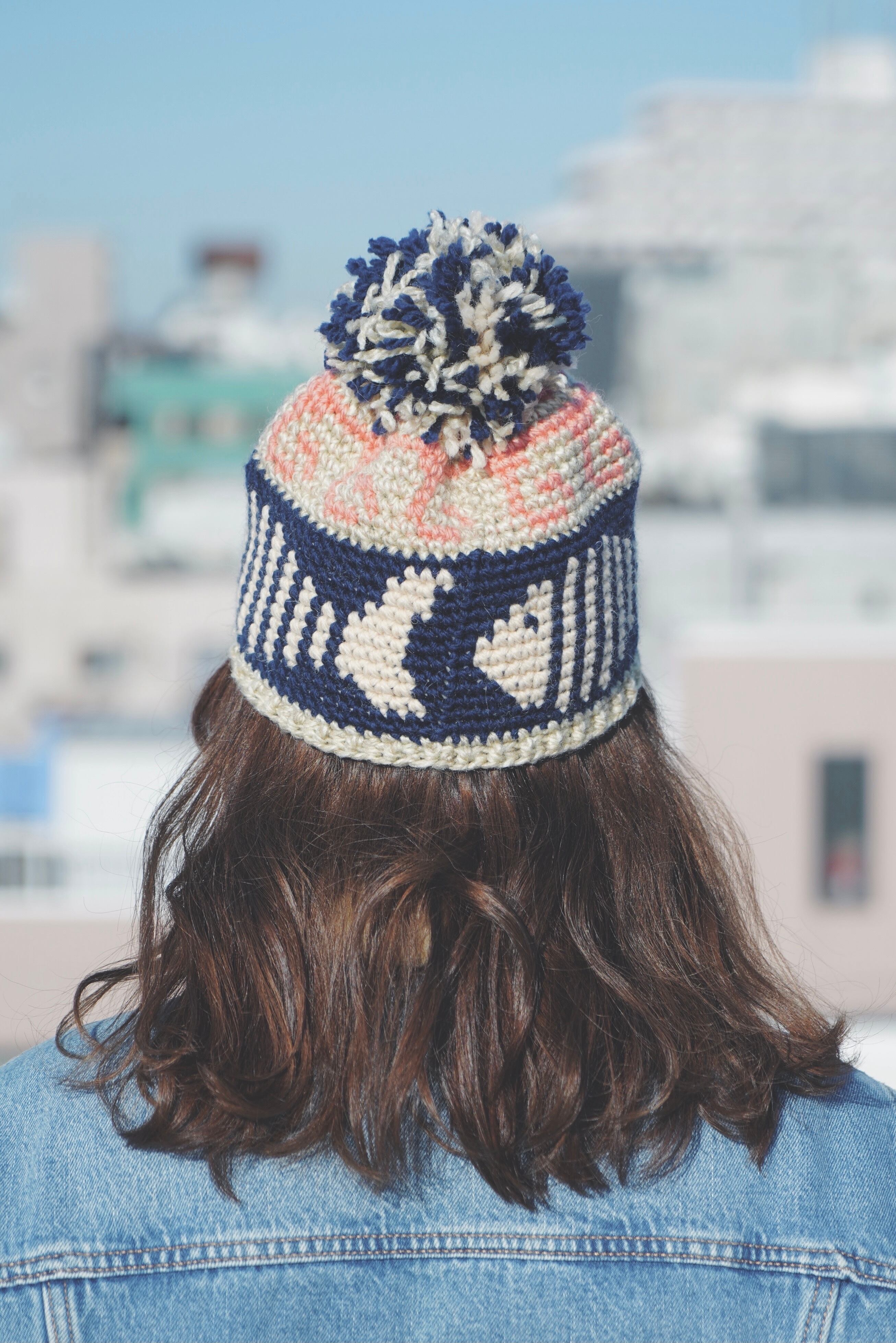 アクリルとウールの糸を使用した、お魚マークのニット帽です。
