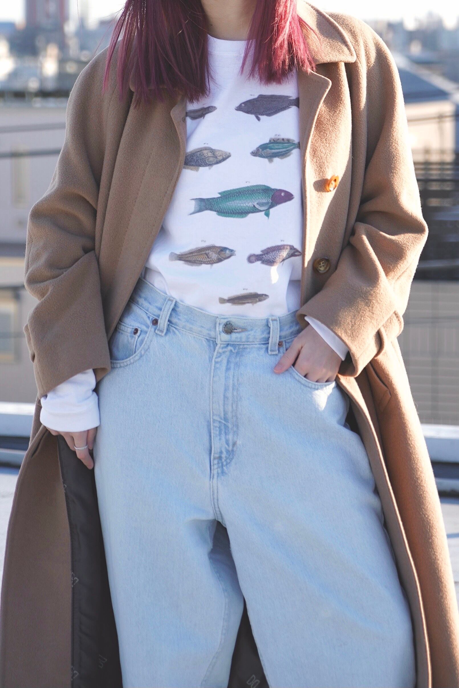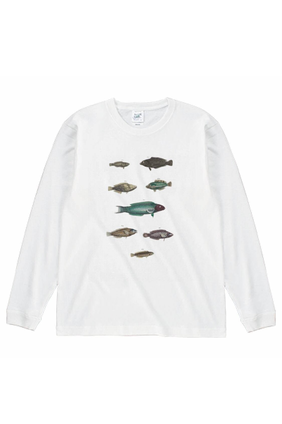 gigiのオリジナルグッズ、定番シルエットのロングスリーブカットソーです。お魚プリントデザインをご用意しました。バックスタイルの、さりげないブランドロゴもポイントです。