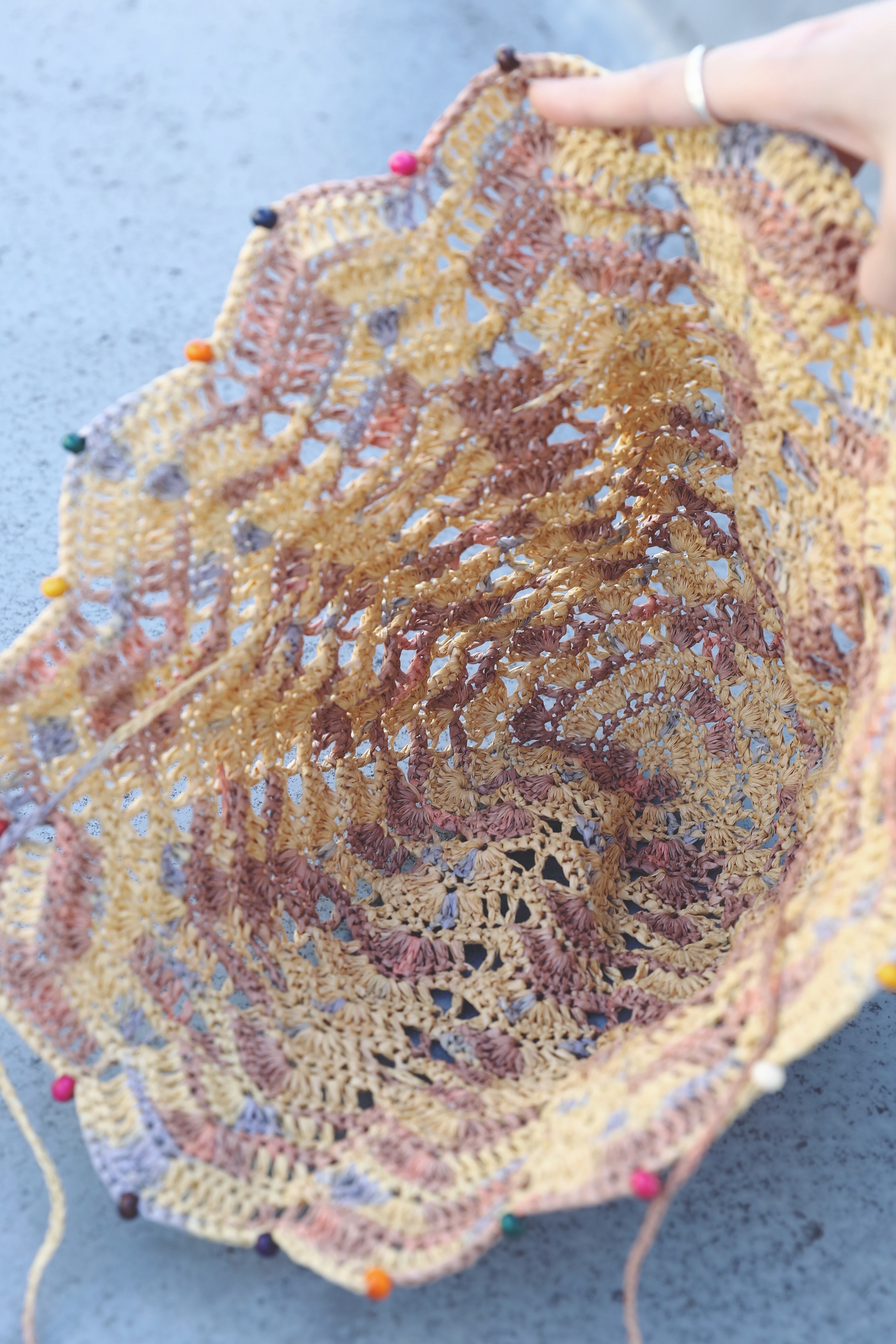 和紙100%の糸を使用した、春夏仕様のクロッシェです。使い込む程に柔らかく、とても軽いので、折り畳んで持ち運びもしていただけます。