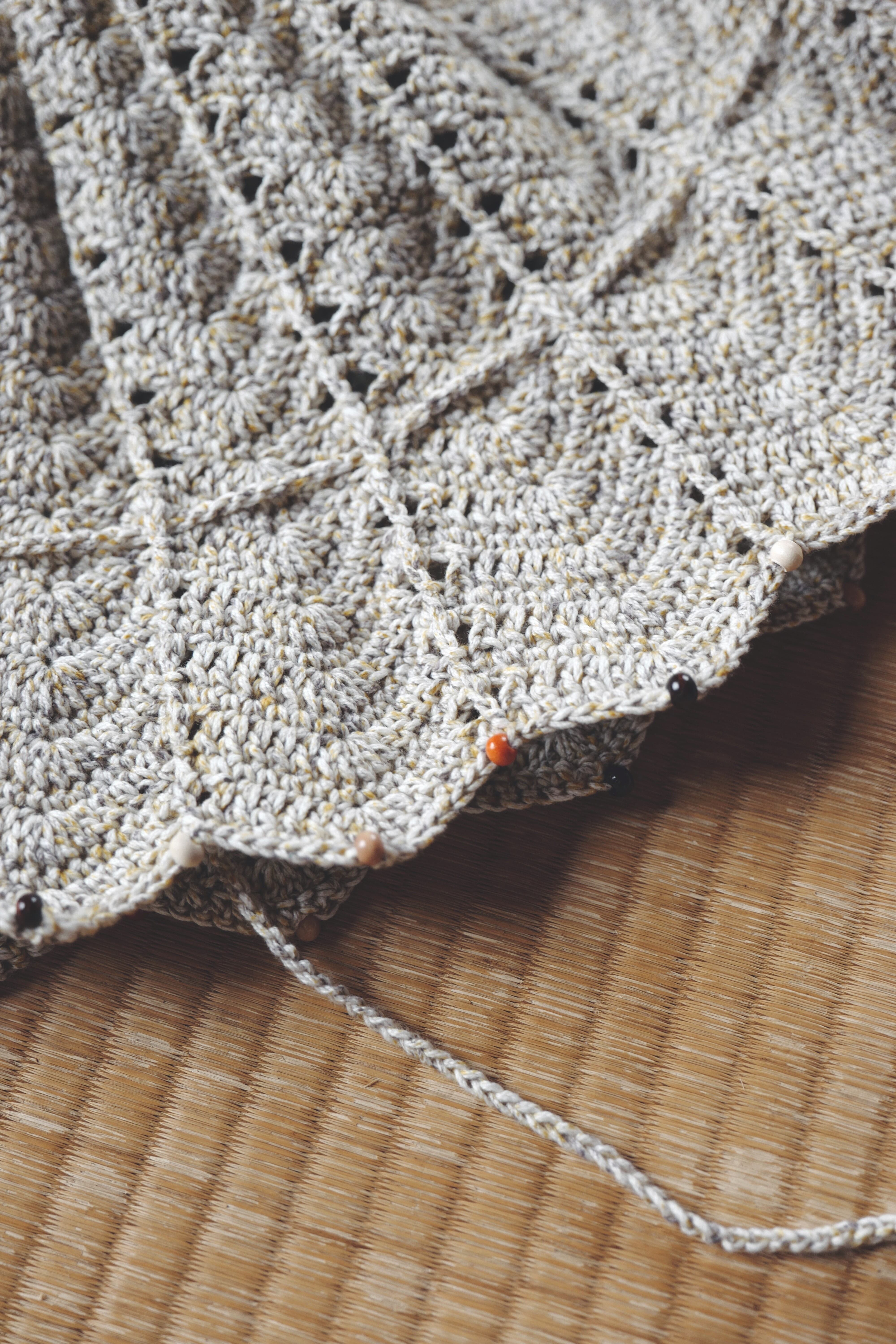 コットン100%の糸を使用した、春夏仕様のクロッシェです。肌触りも良く柔らかいので、折り畳んで持ち運びもしていただけます。