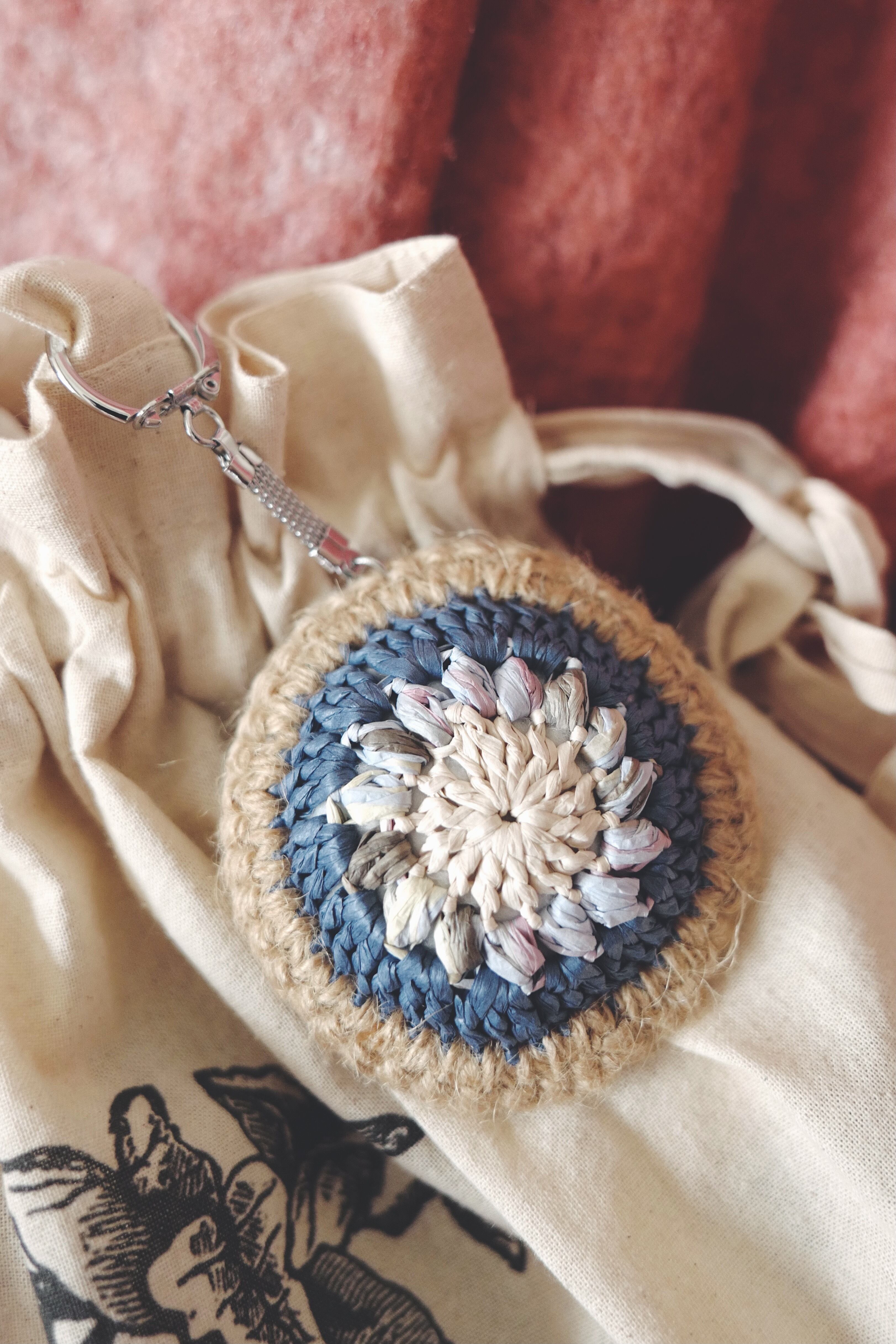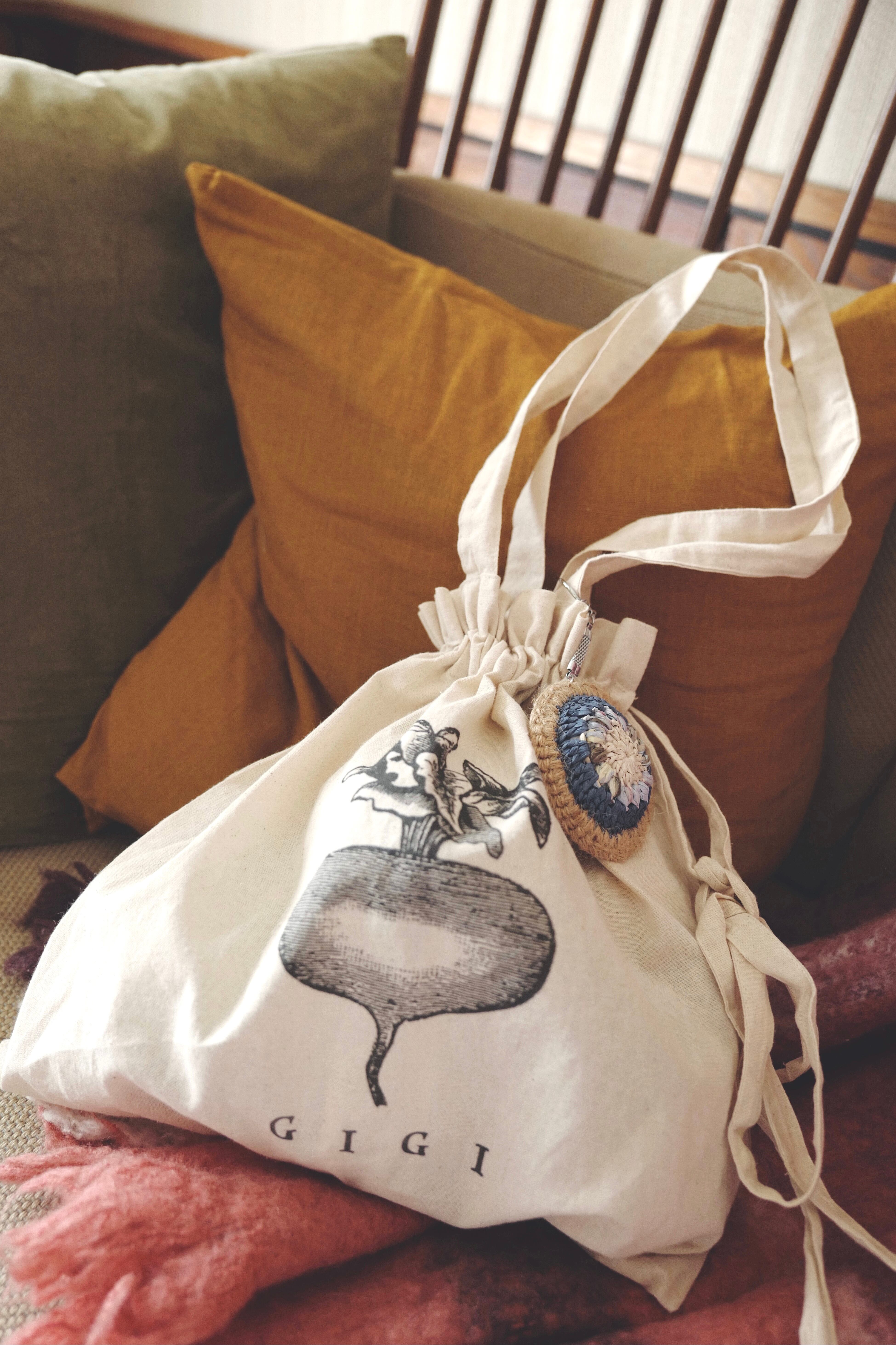gigiのオリジナルグッズ、綿100%のギャザーバッグです。お買い上げいただいたお客様に、ランダムカラーのクロシェキーホルダーをプレゼントいたします。