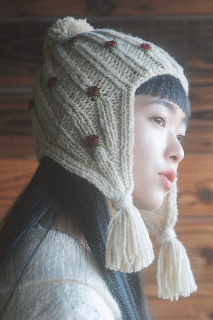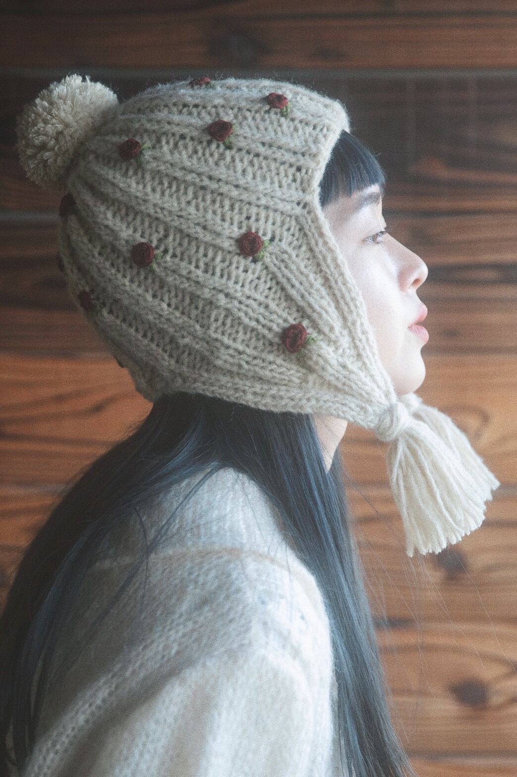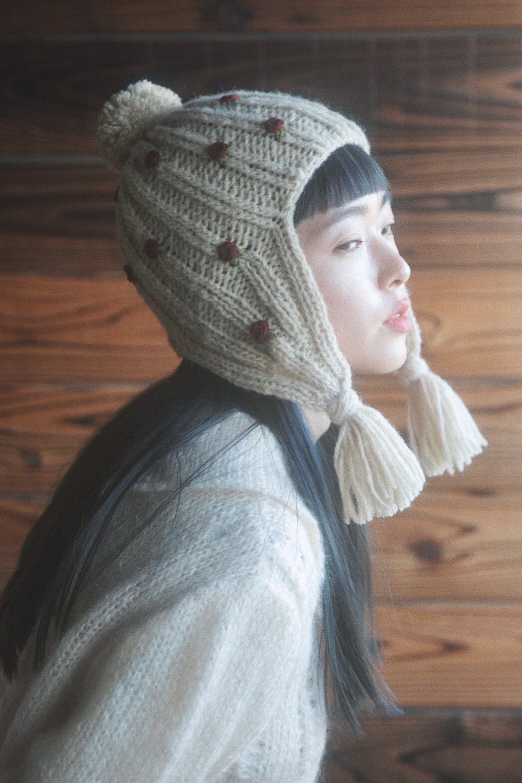 柔らかな糸で編んだニット帽です。小さなお花の刺繍をちりばめました。ポンポンには、小さなピンが付いておりますので、お好みで取り外していただけます。