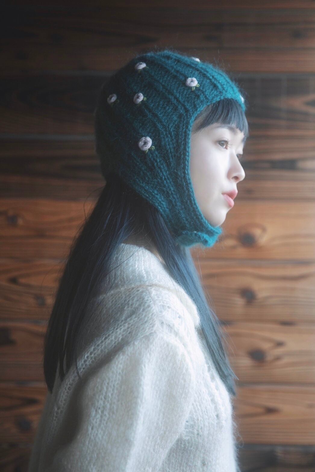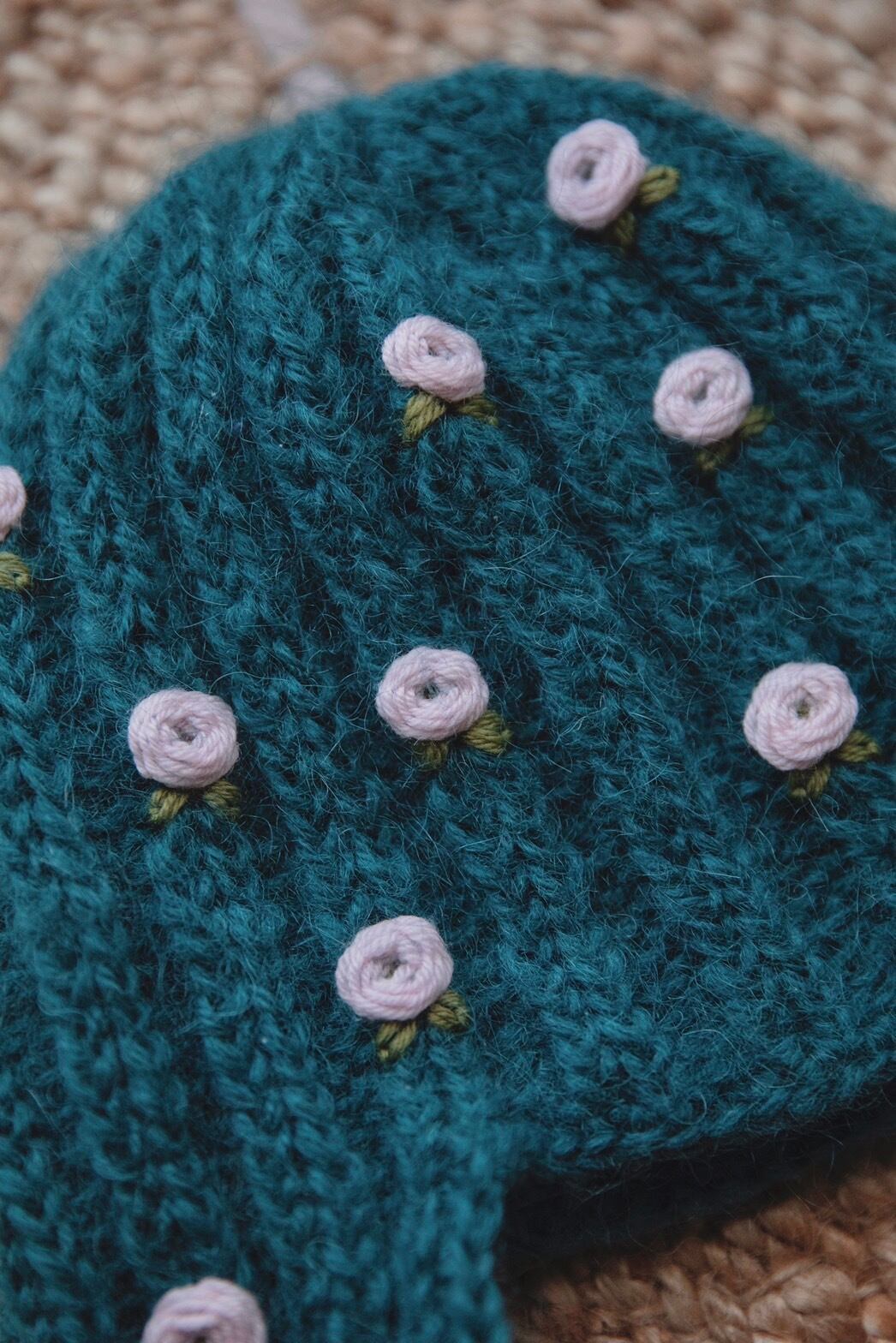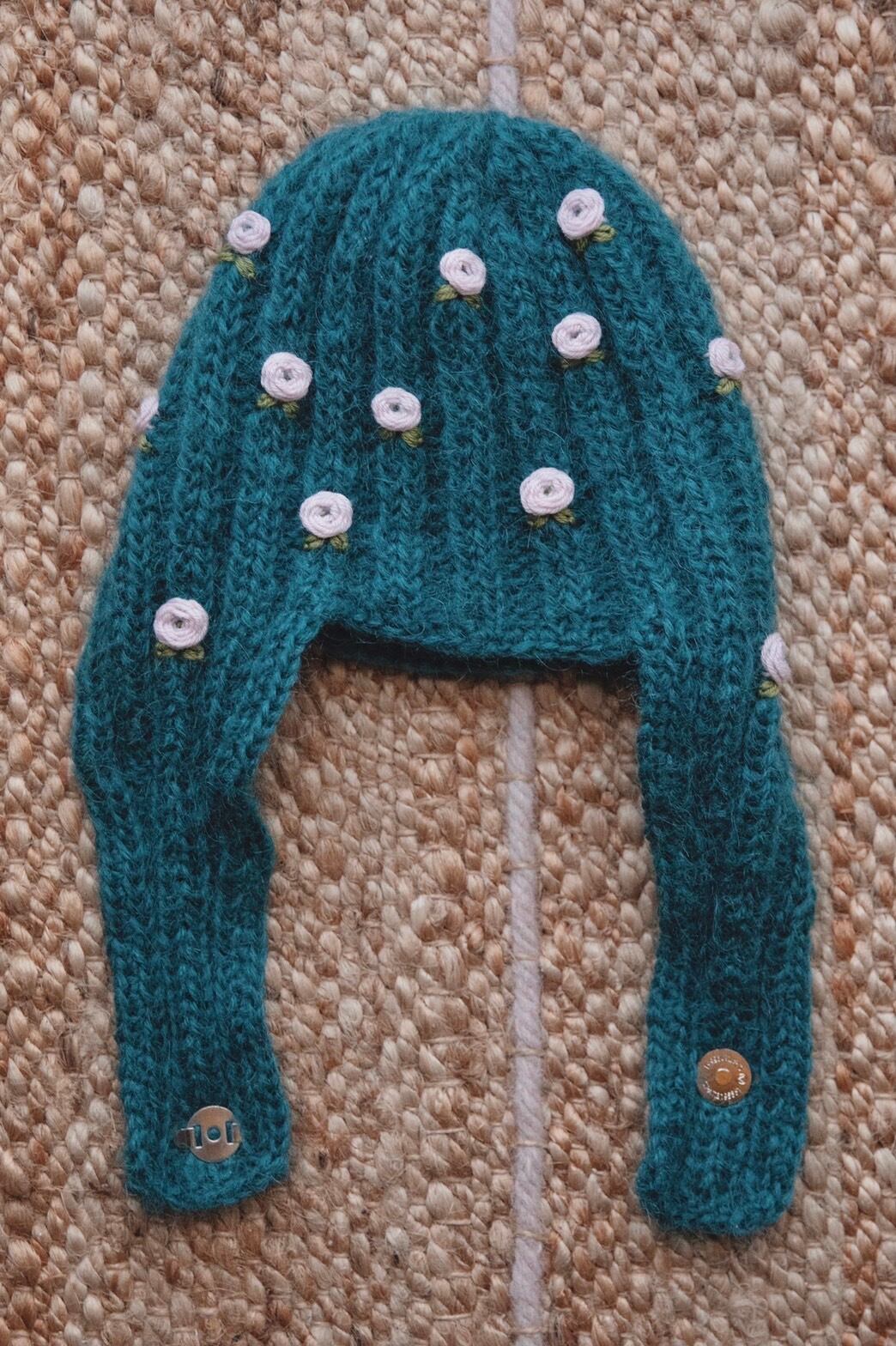モヘア糸で編んだニット帽です。小さなお花の刺繍を散りばめました。