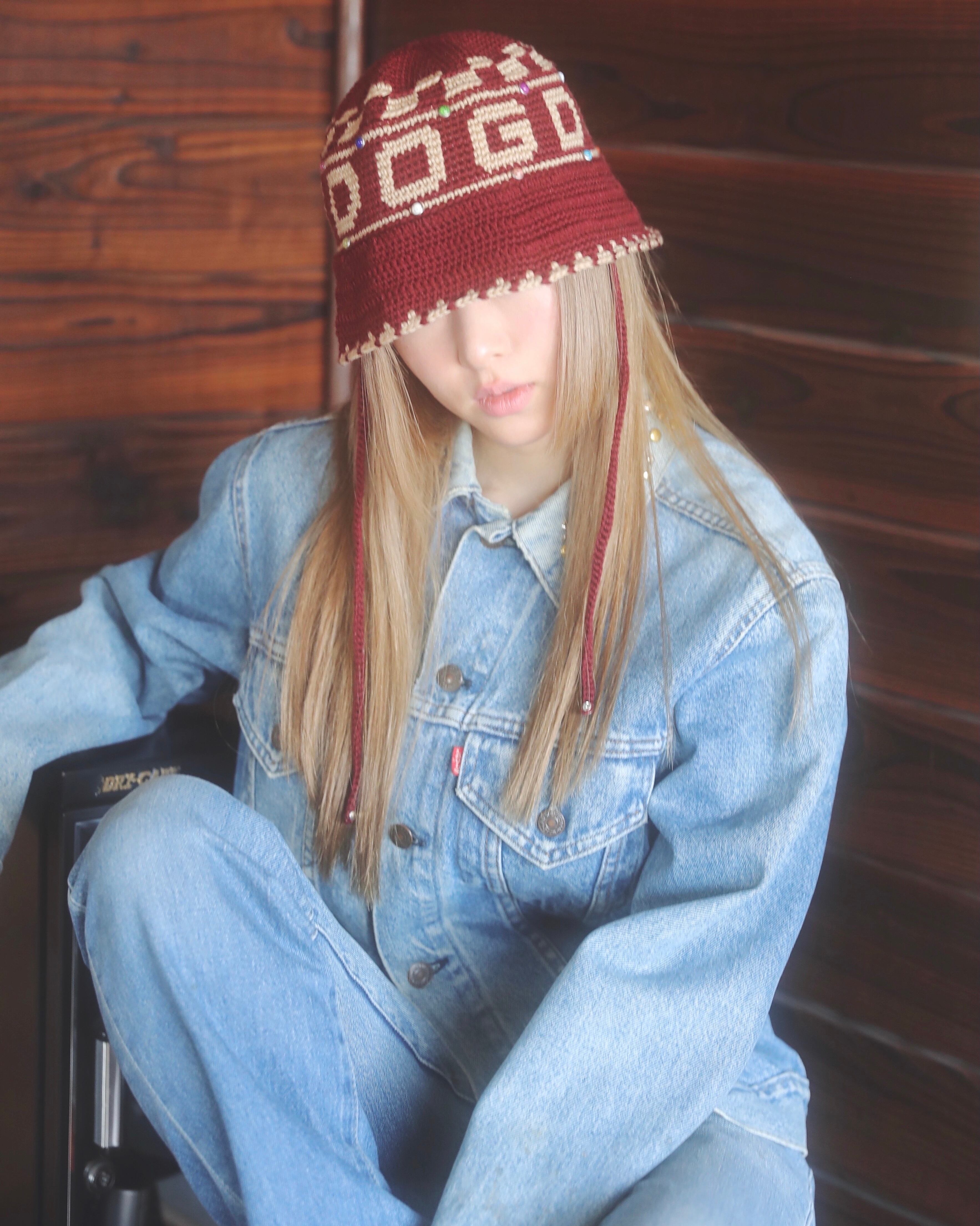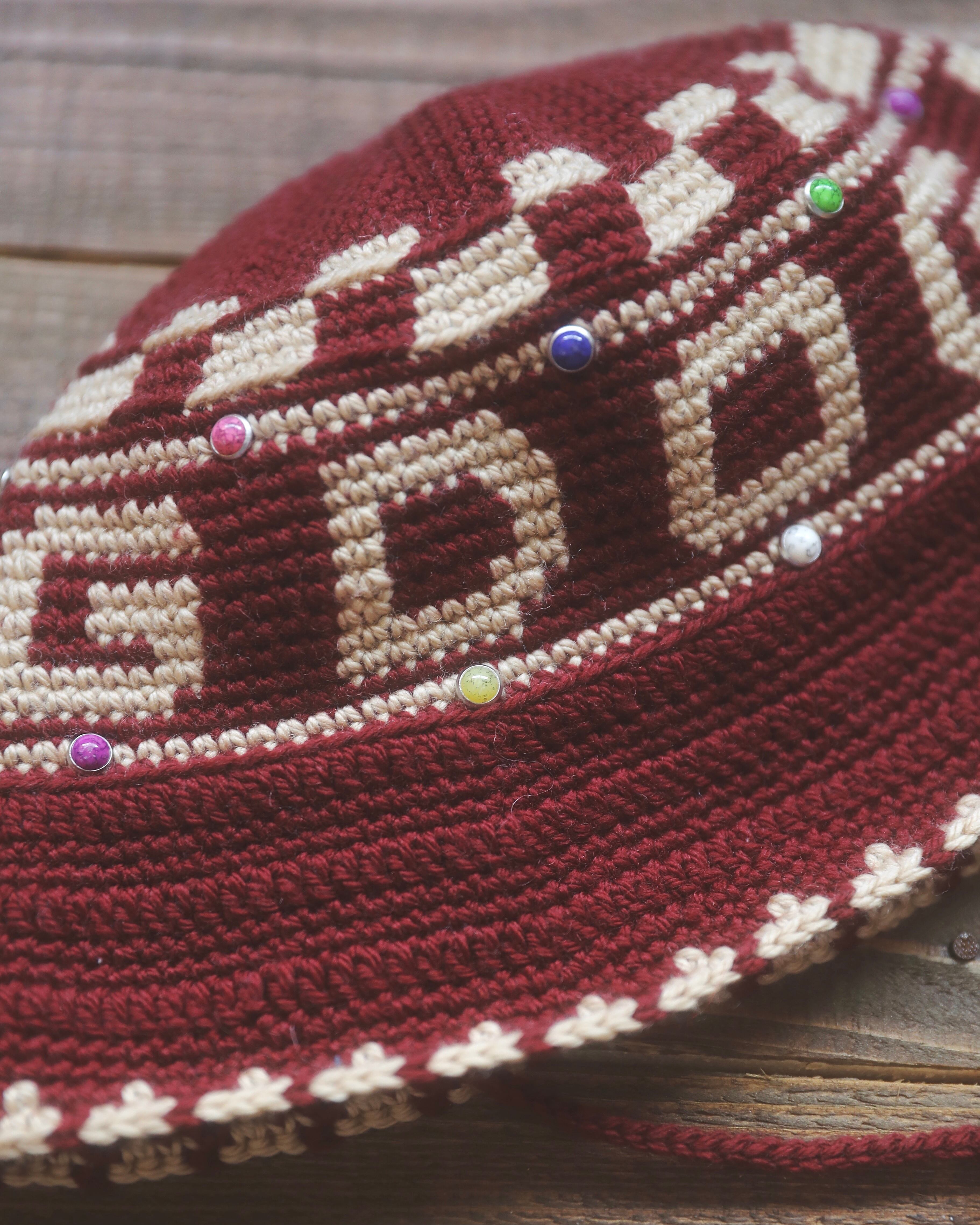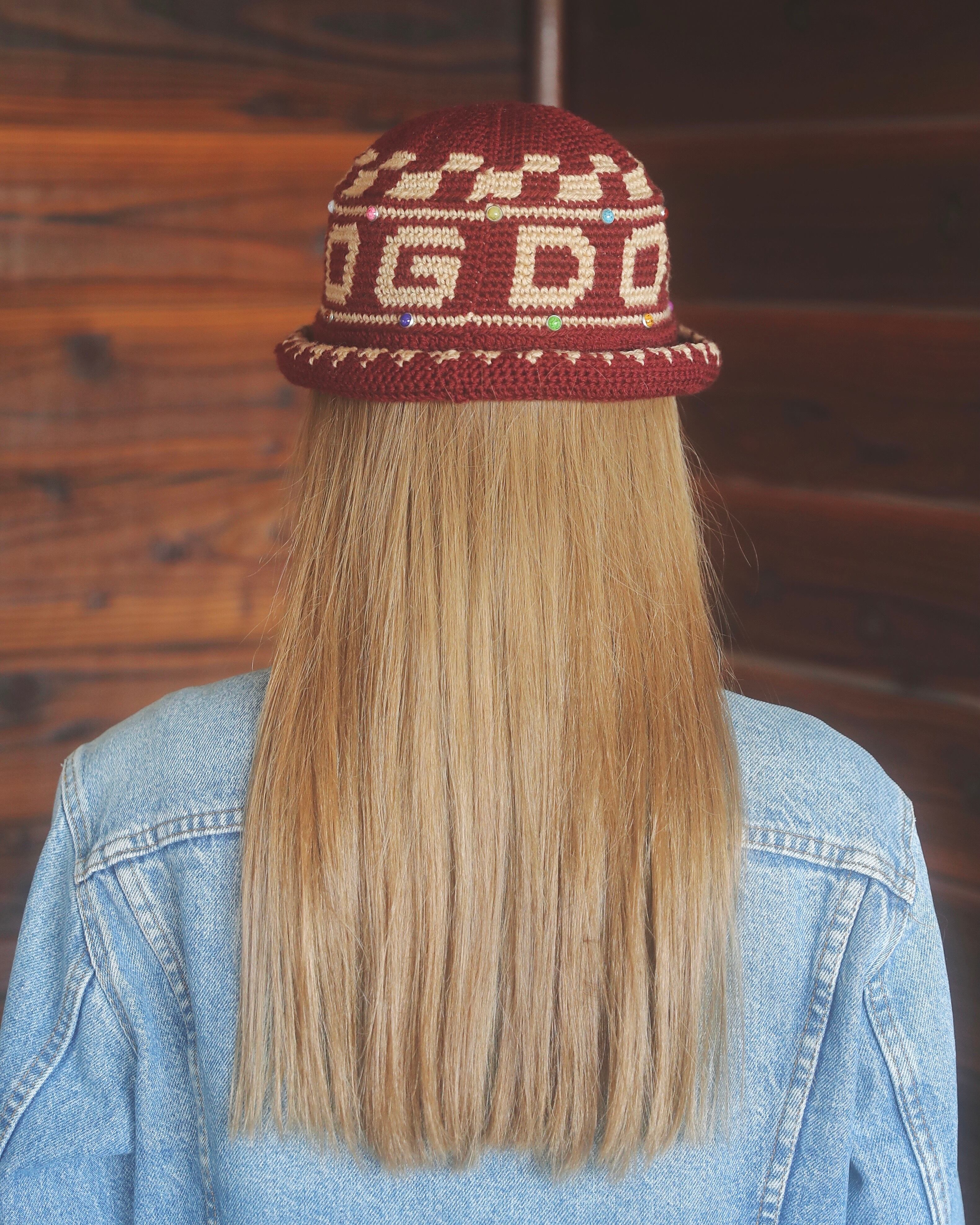 メリノウール100%の糸を使用した、DOGロゴのクロッシェです。アクセントに、カラフルなストーンスタッズを打ちました。折り畳んで持ち運びもしていただけます。