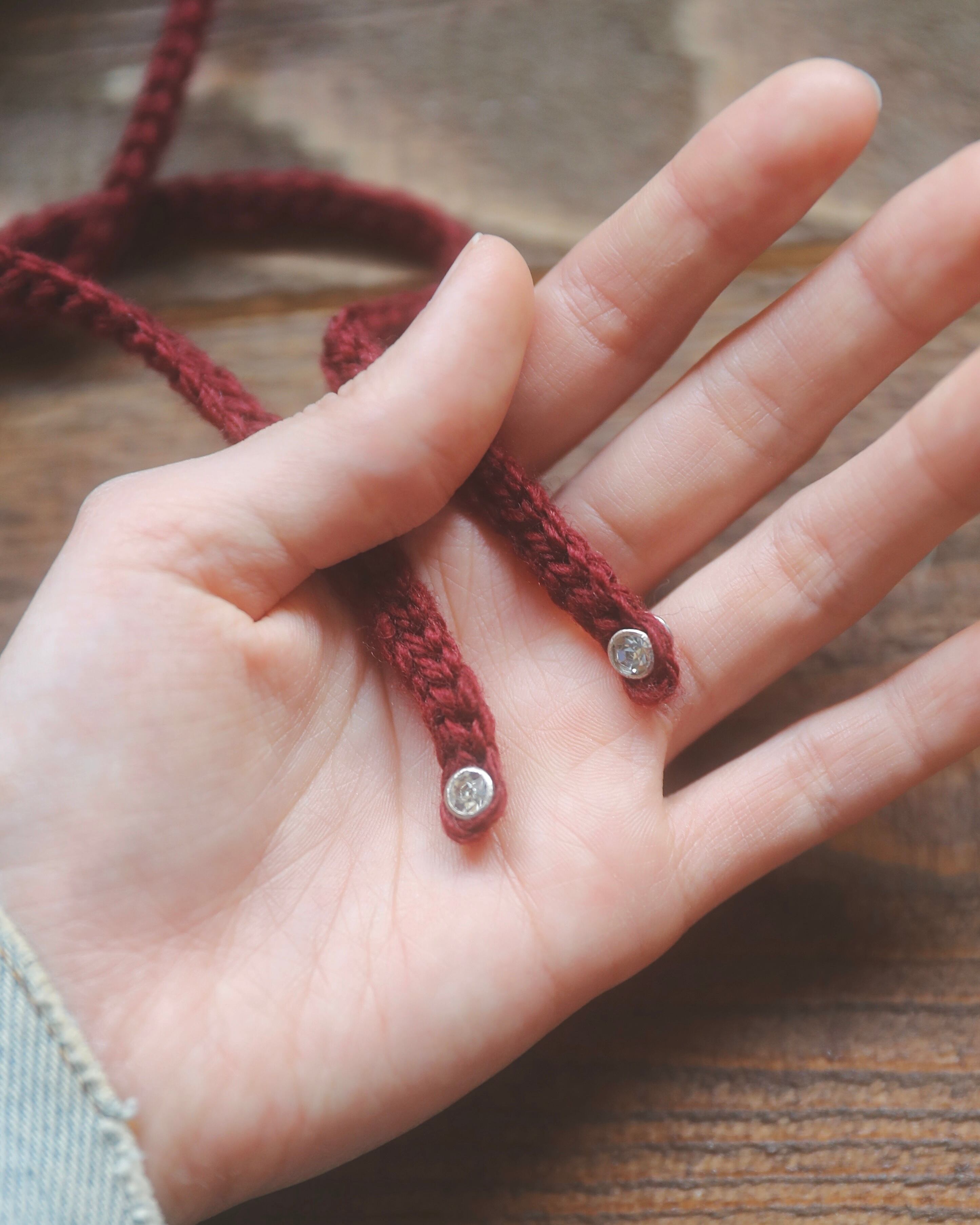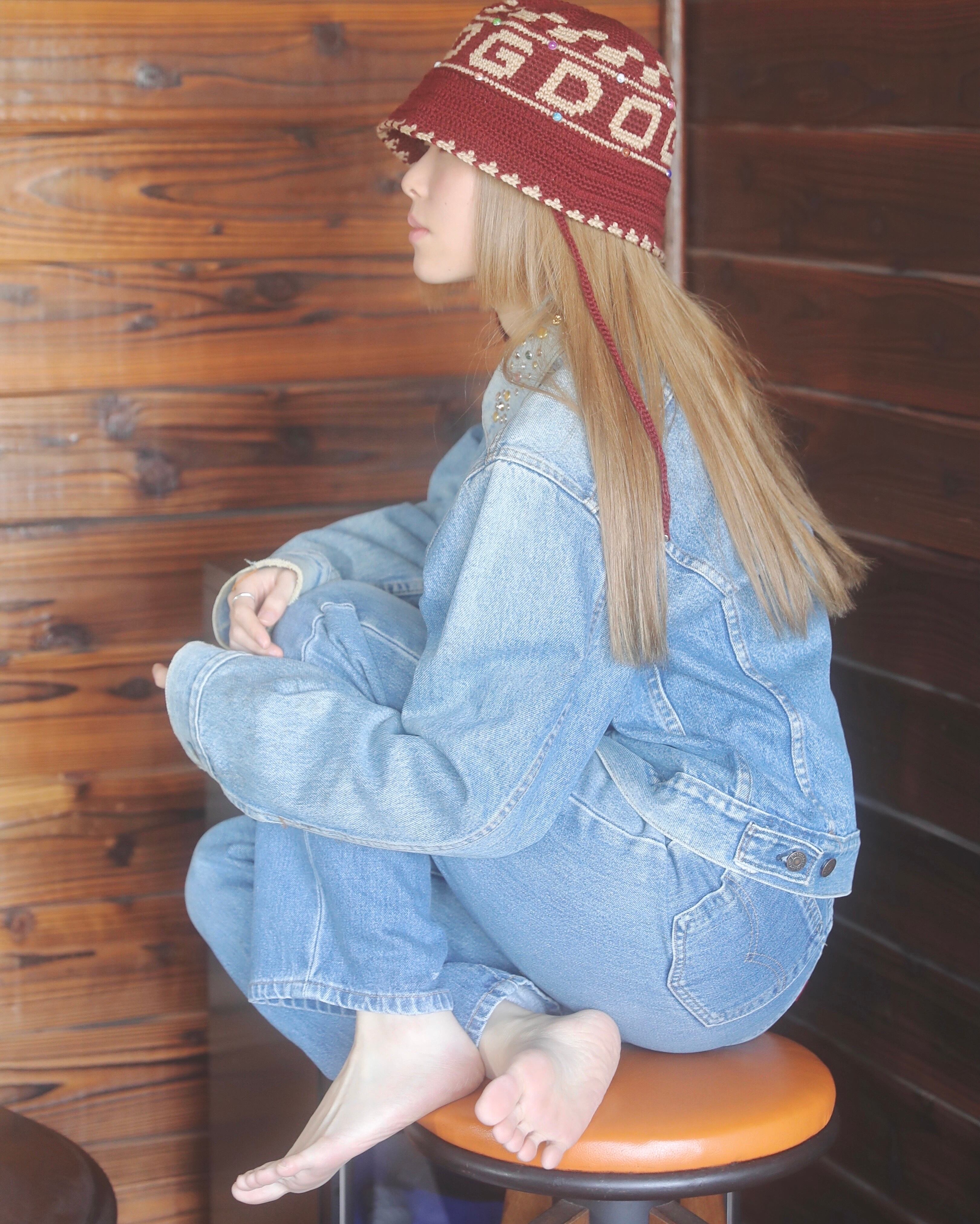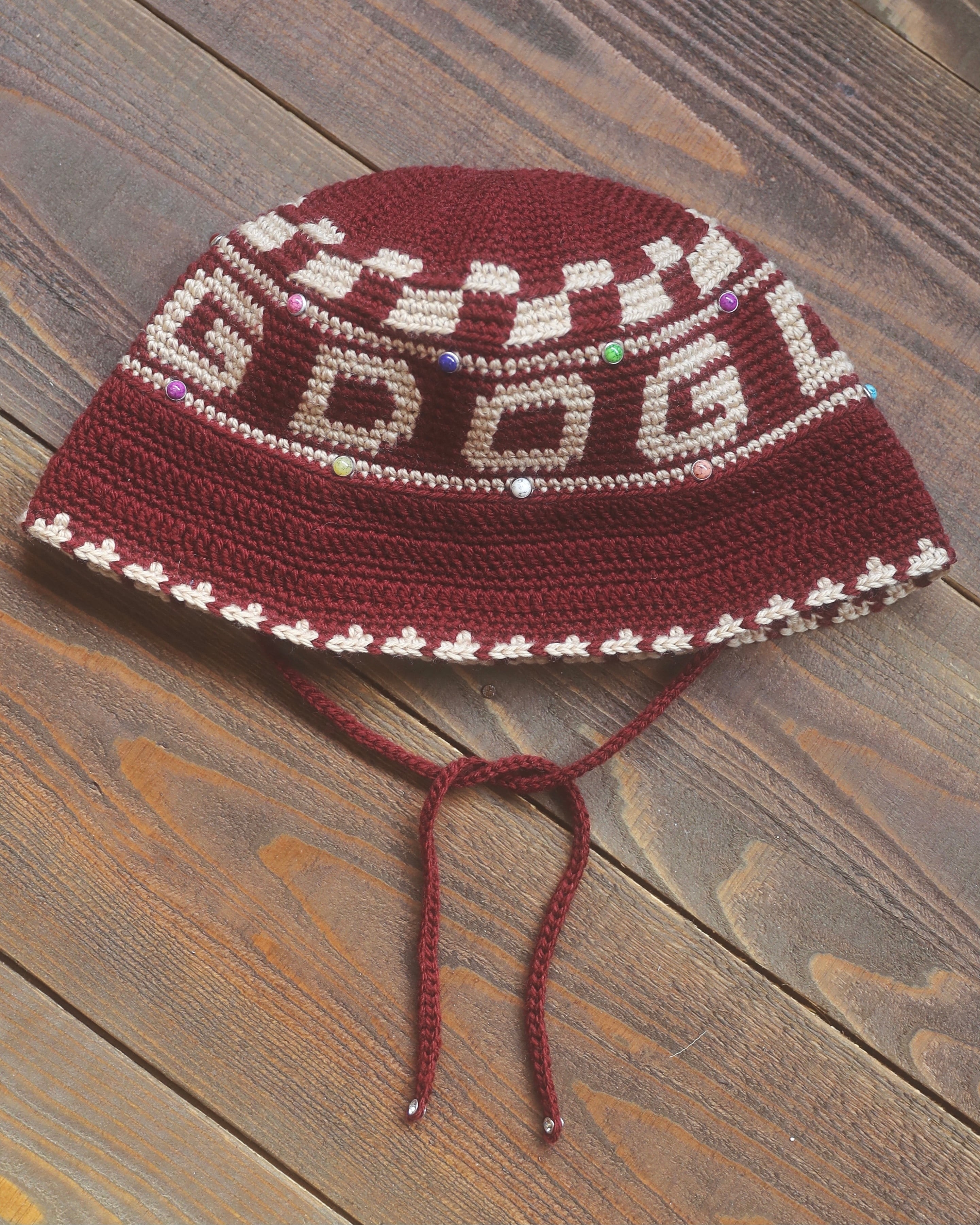メリノウール100%の糸を使用した、DOGロゴのクロッシェです。アクセントに、カラフルなストーンスタッズを打ちました。折り畳んで持ち運びもしていただけます。