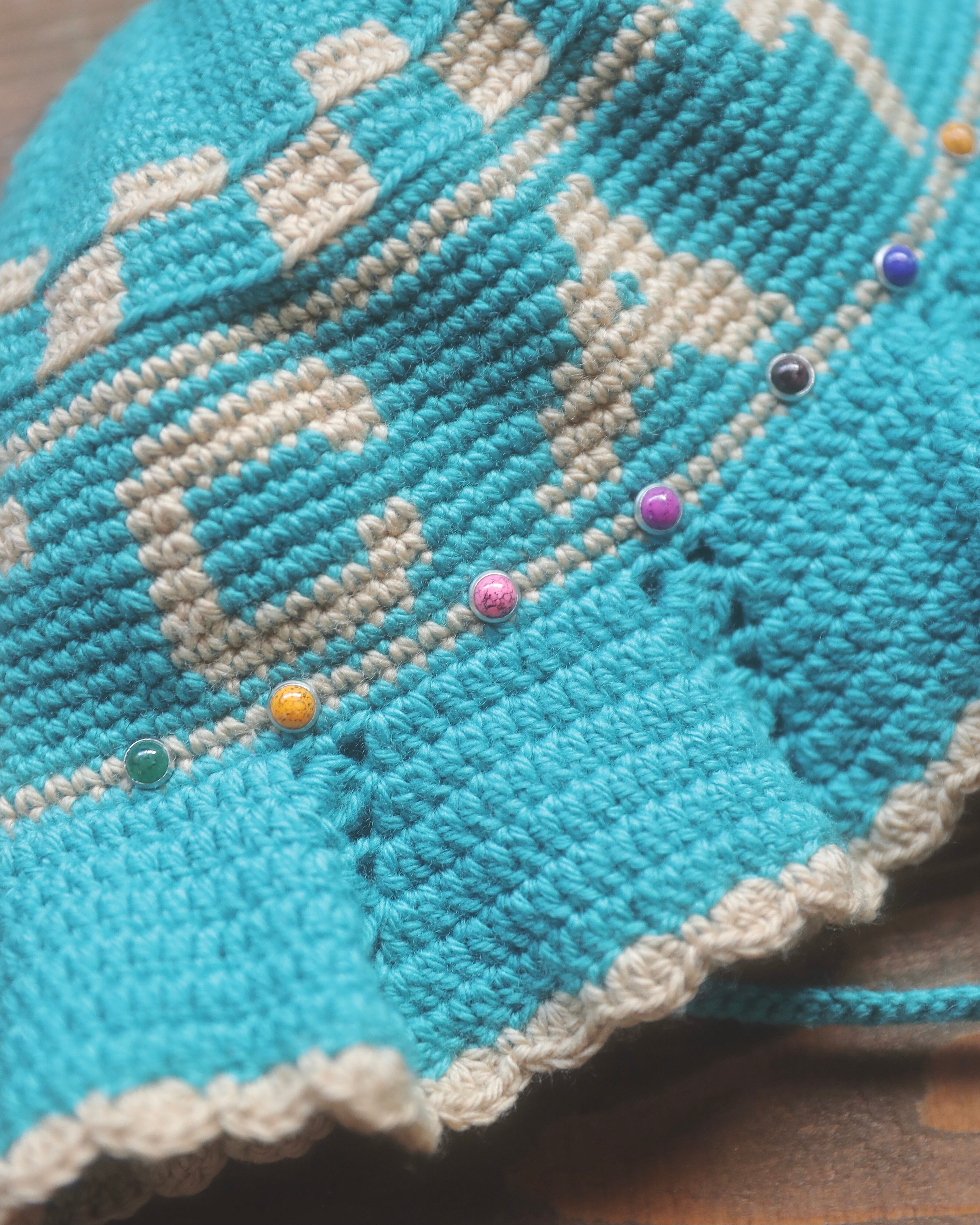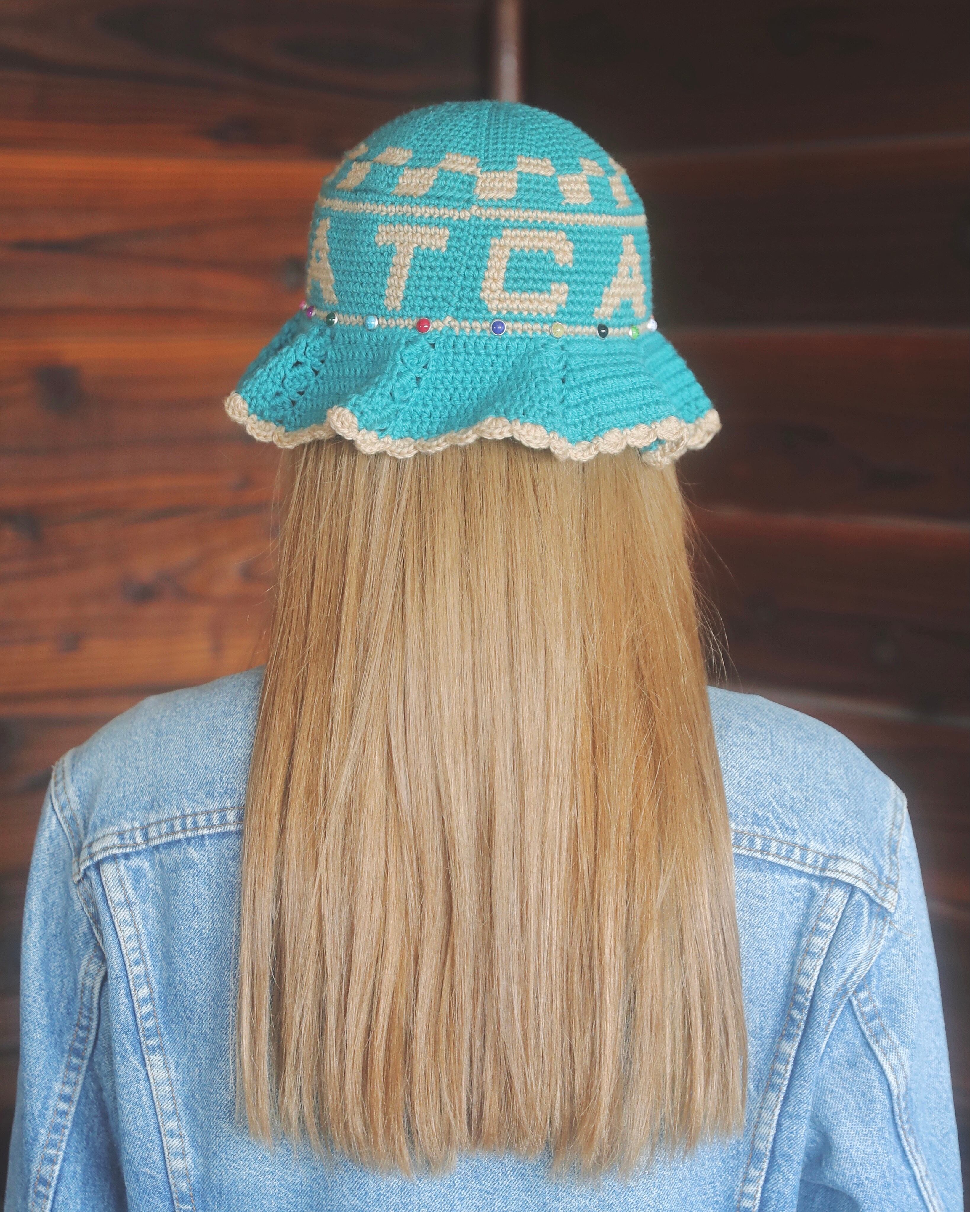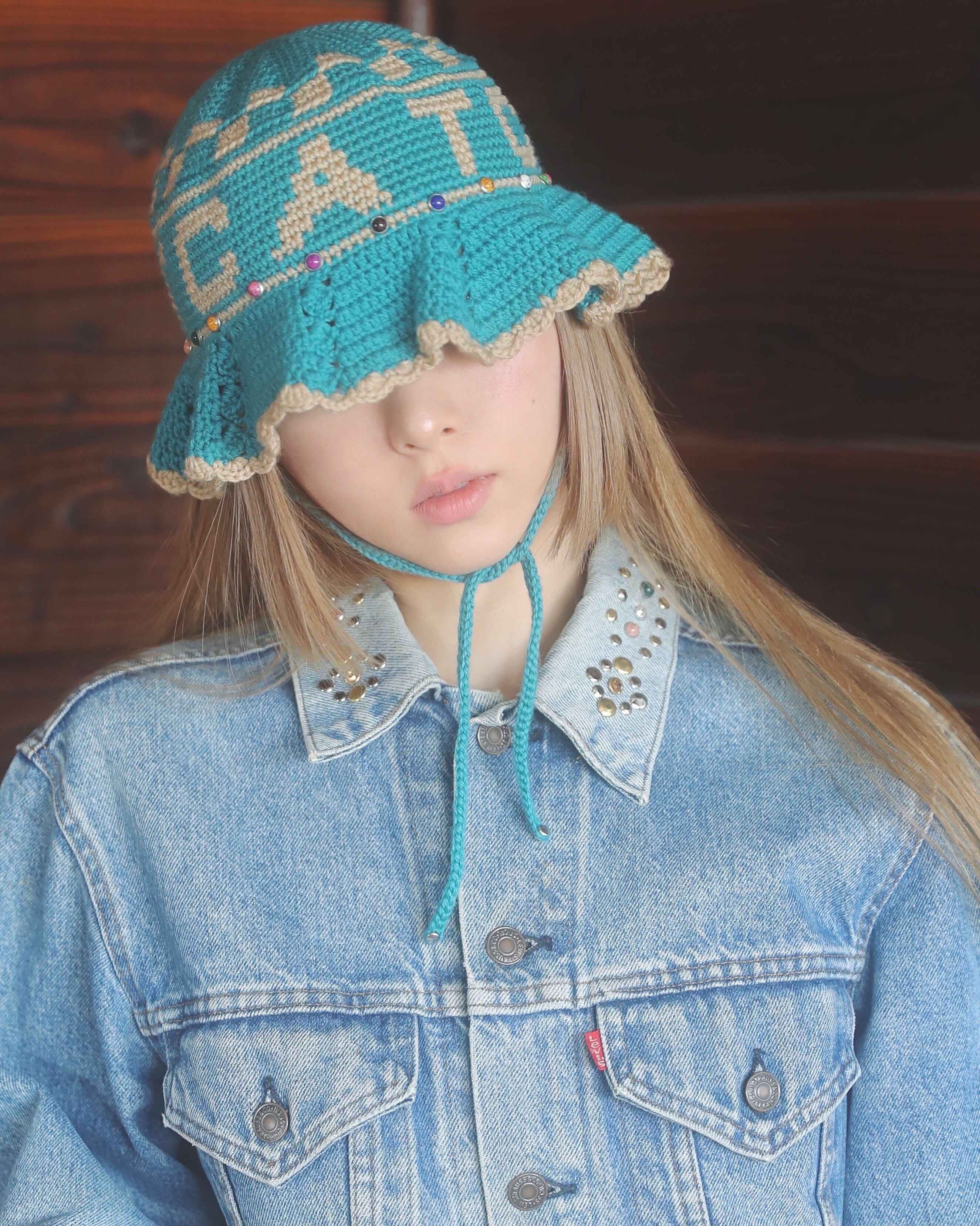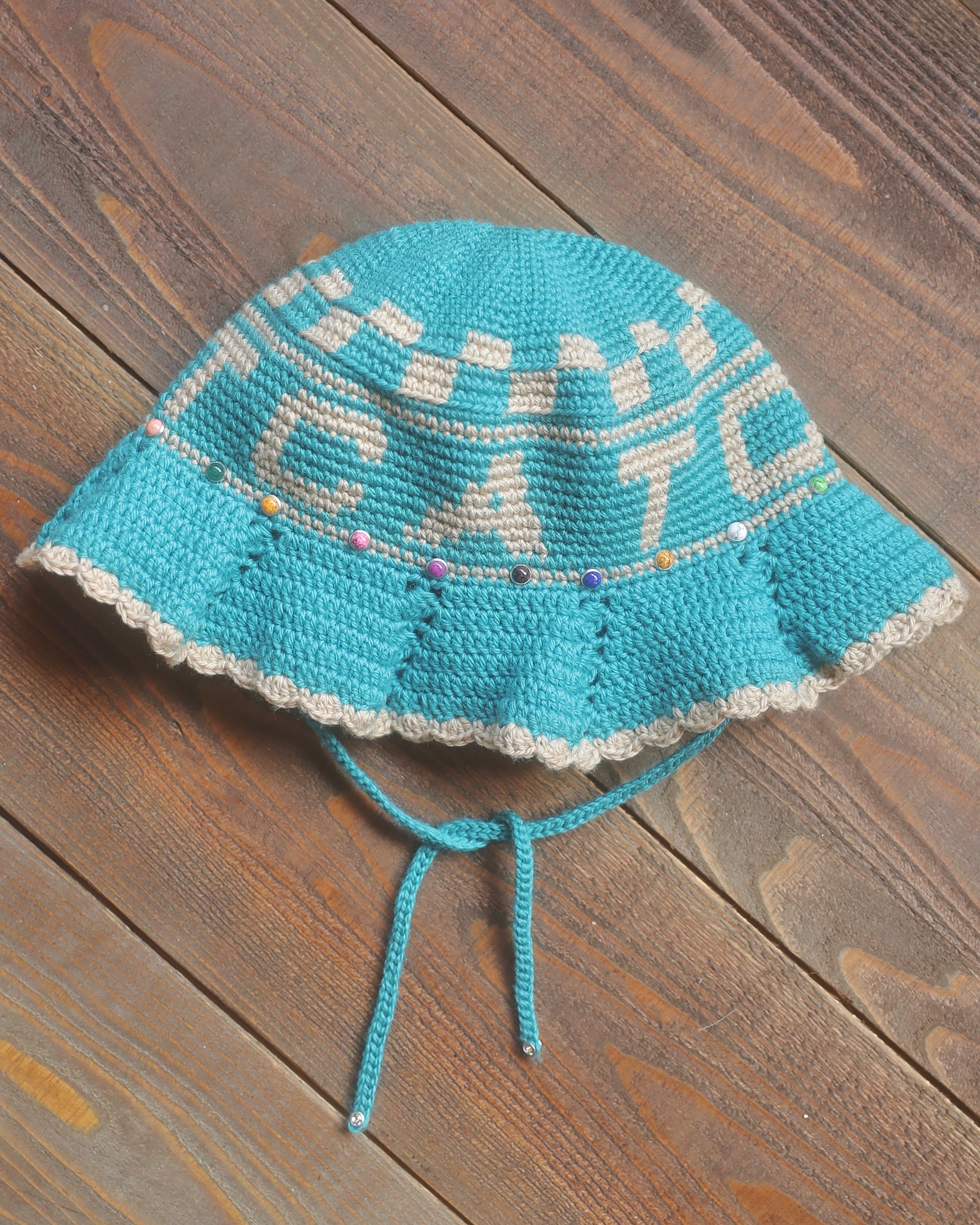 メリノウール100%の糸を使用した、CATロゴのクロッシェです。アクセントに、カラフルなストーンスタッズを打ちました。折り畳んで持ち運びもしていただけます。