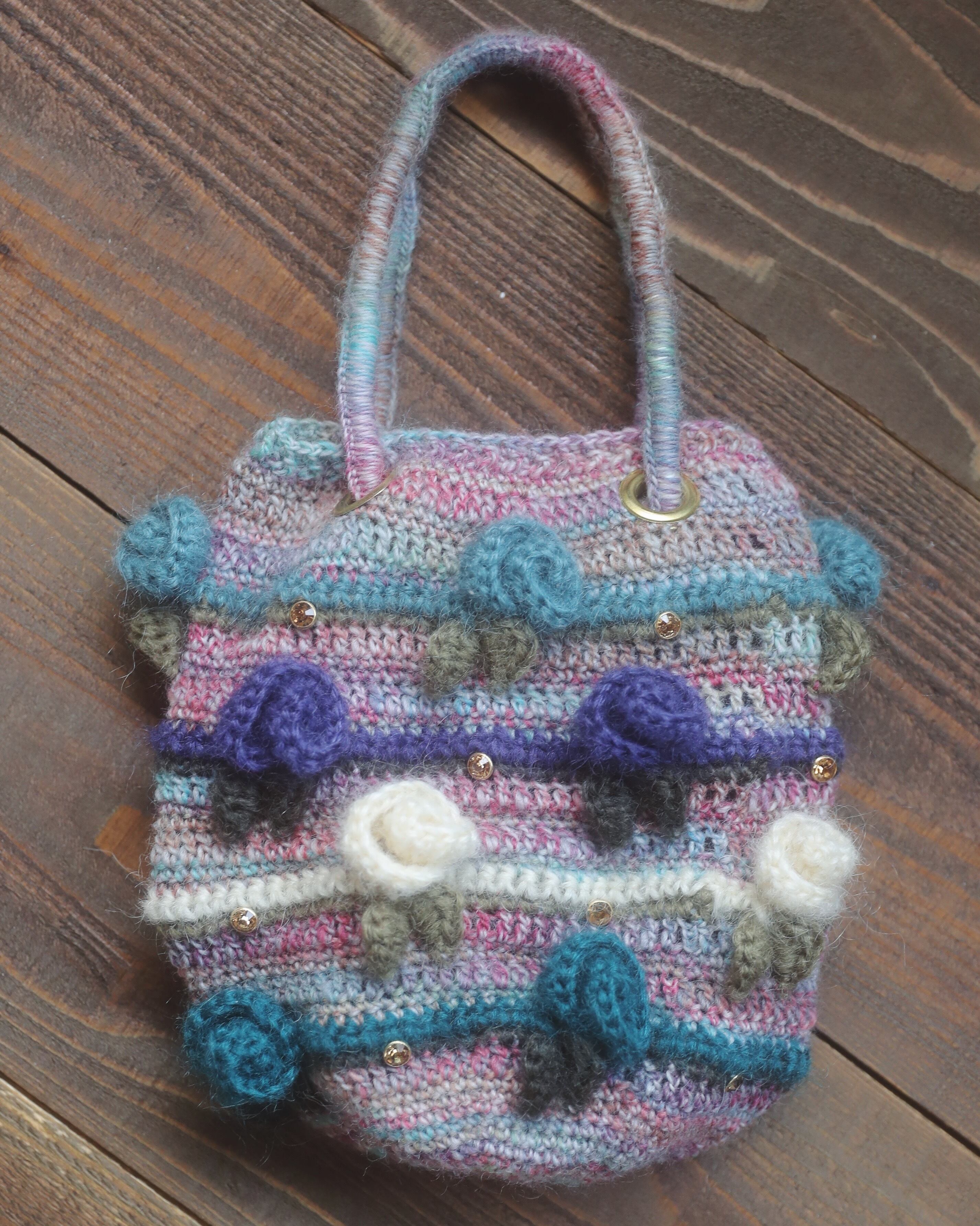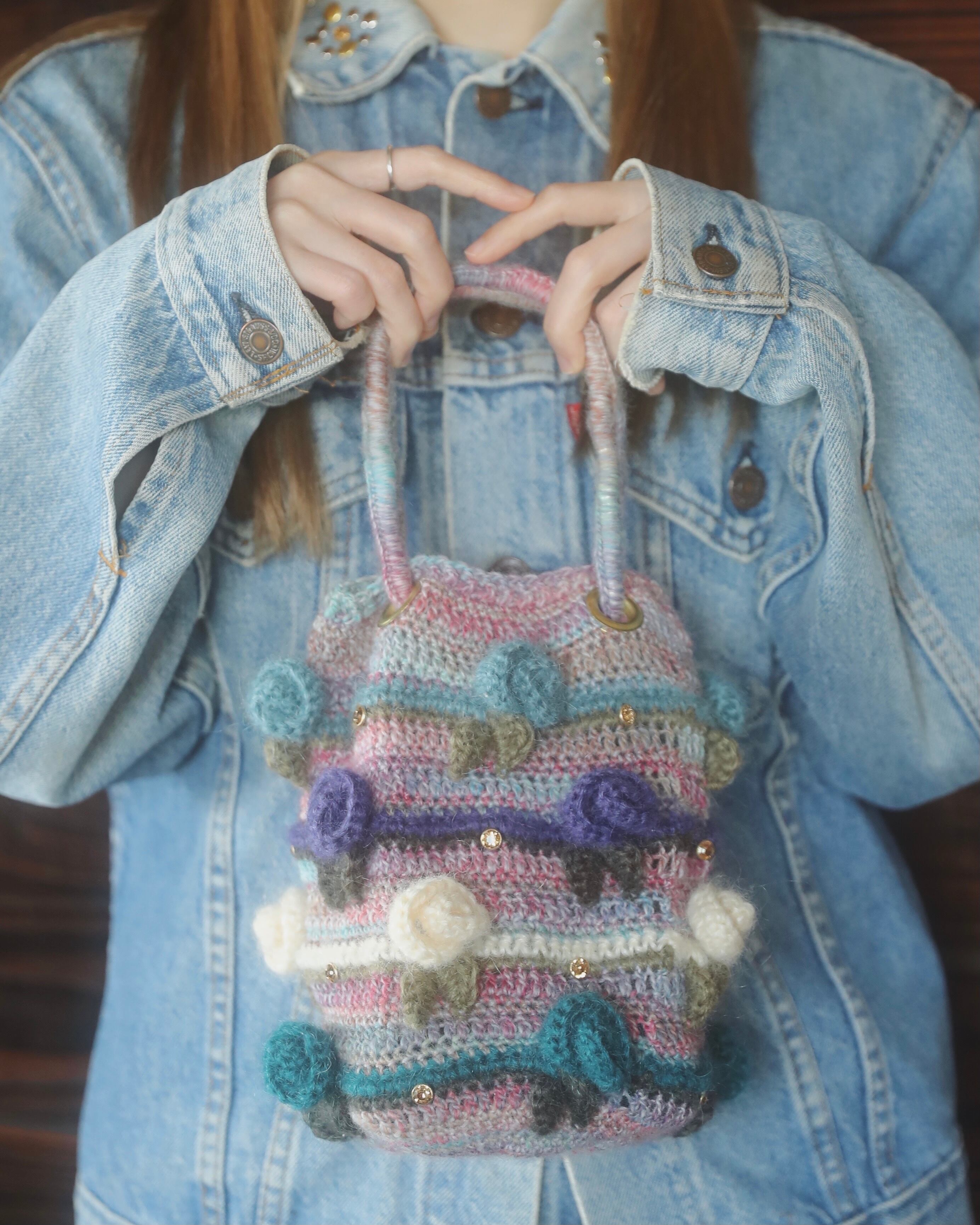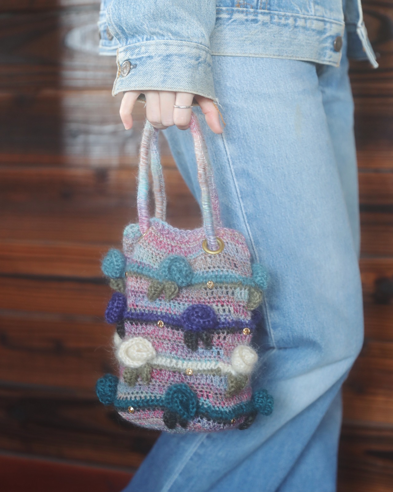 モヘア糸とウール糸で編んだニットバッグです。ぷりっとしたお花のモチーフと、さりげなく輝くスタッズが可愛らしい1点です。