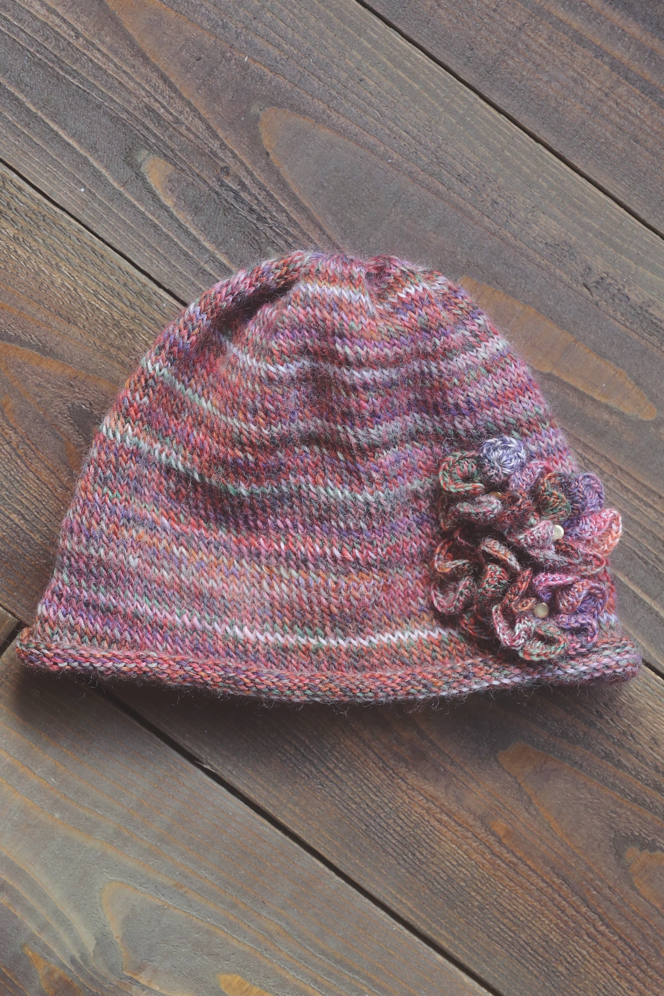 ウール糸で編んだニットキャップです。ふりっとしたお花のモチーフと、さりげなく輝くスタッズがアクセントになります。