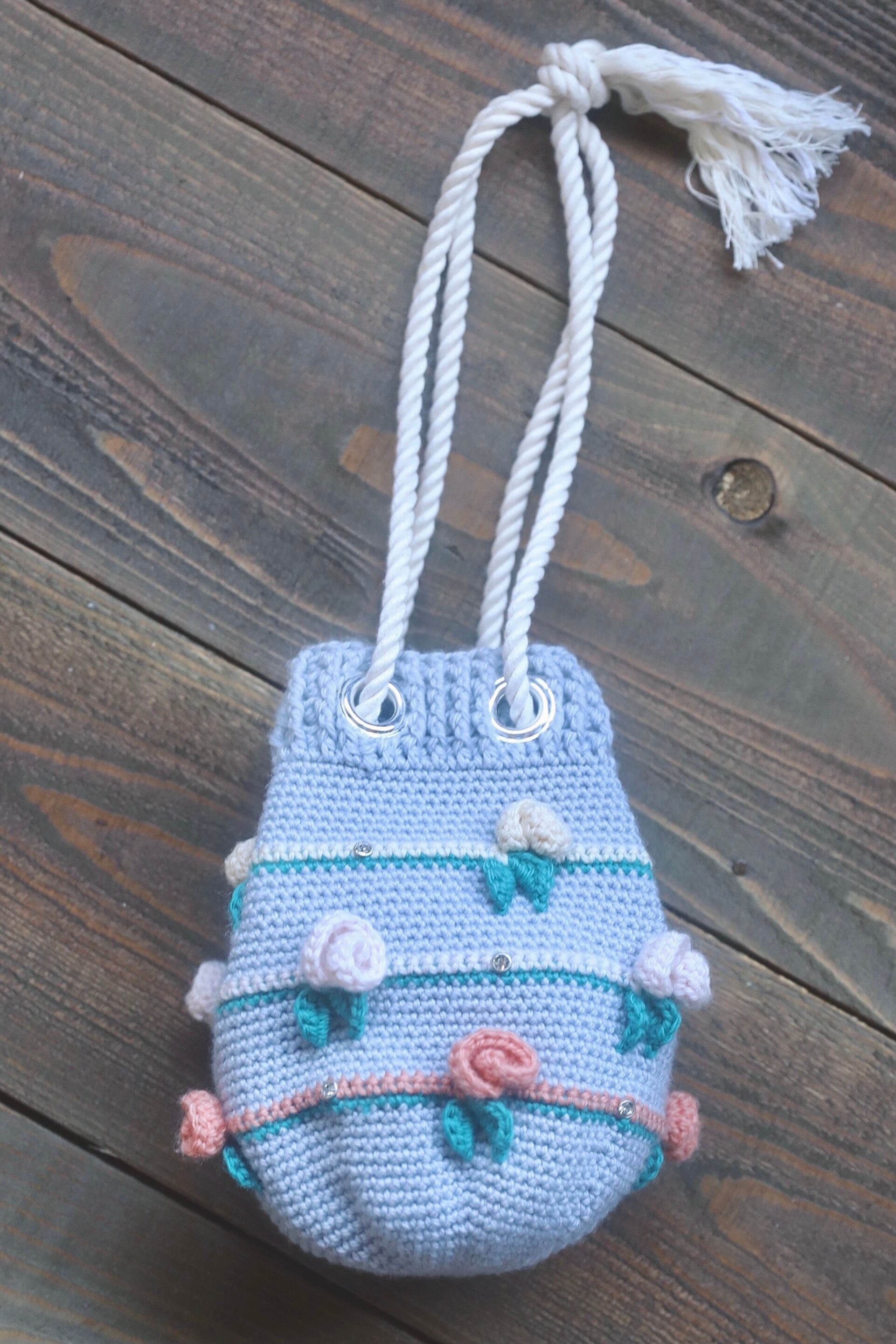 ウール糸で編んだニットバッグです。ぷりっとしたお花のモチーフと、さりげなく輝くスタッズが可愛らしい1点です。