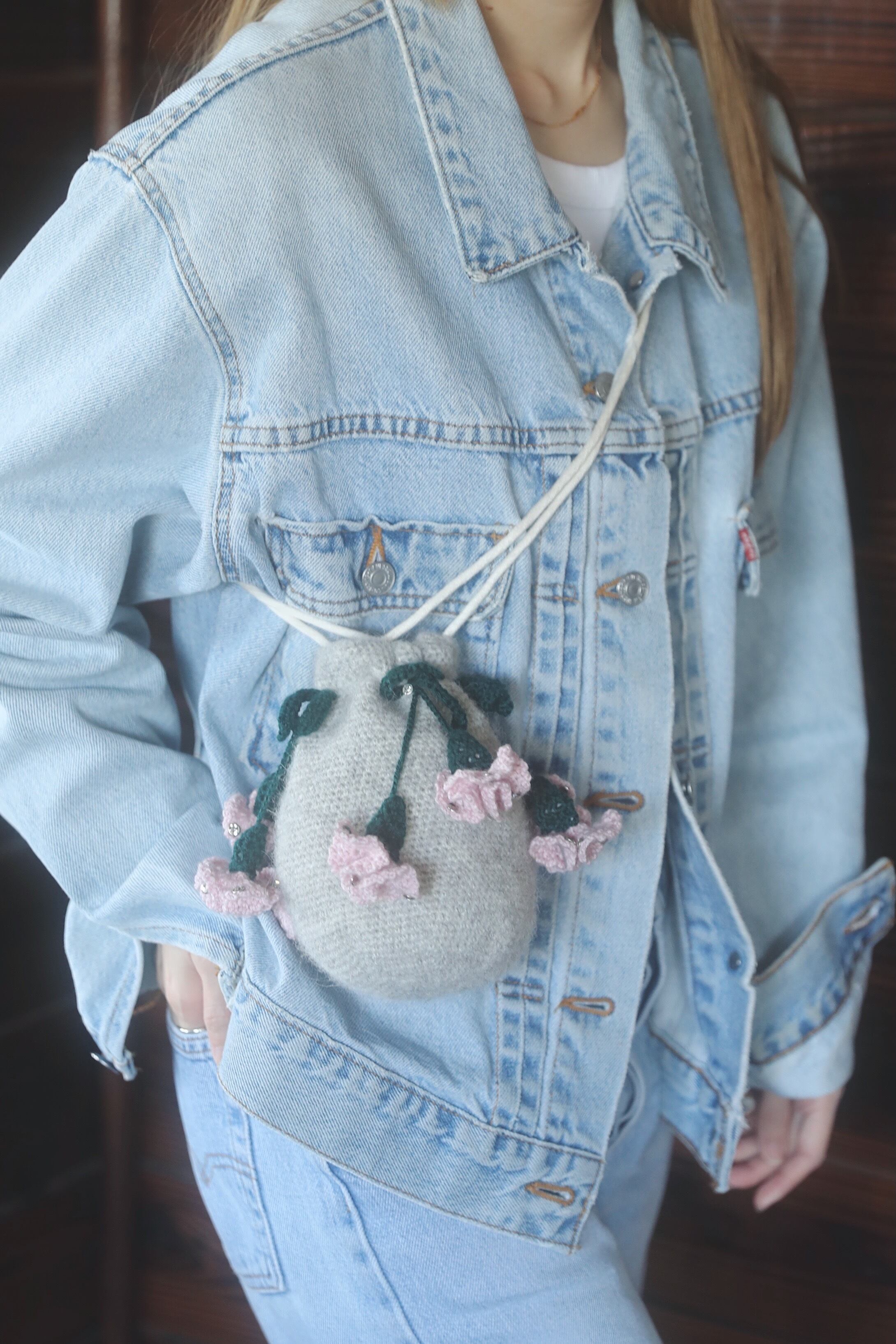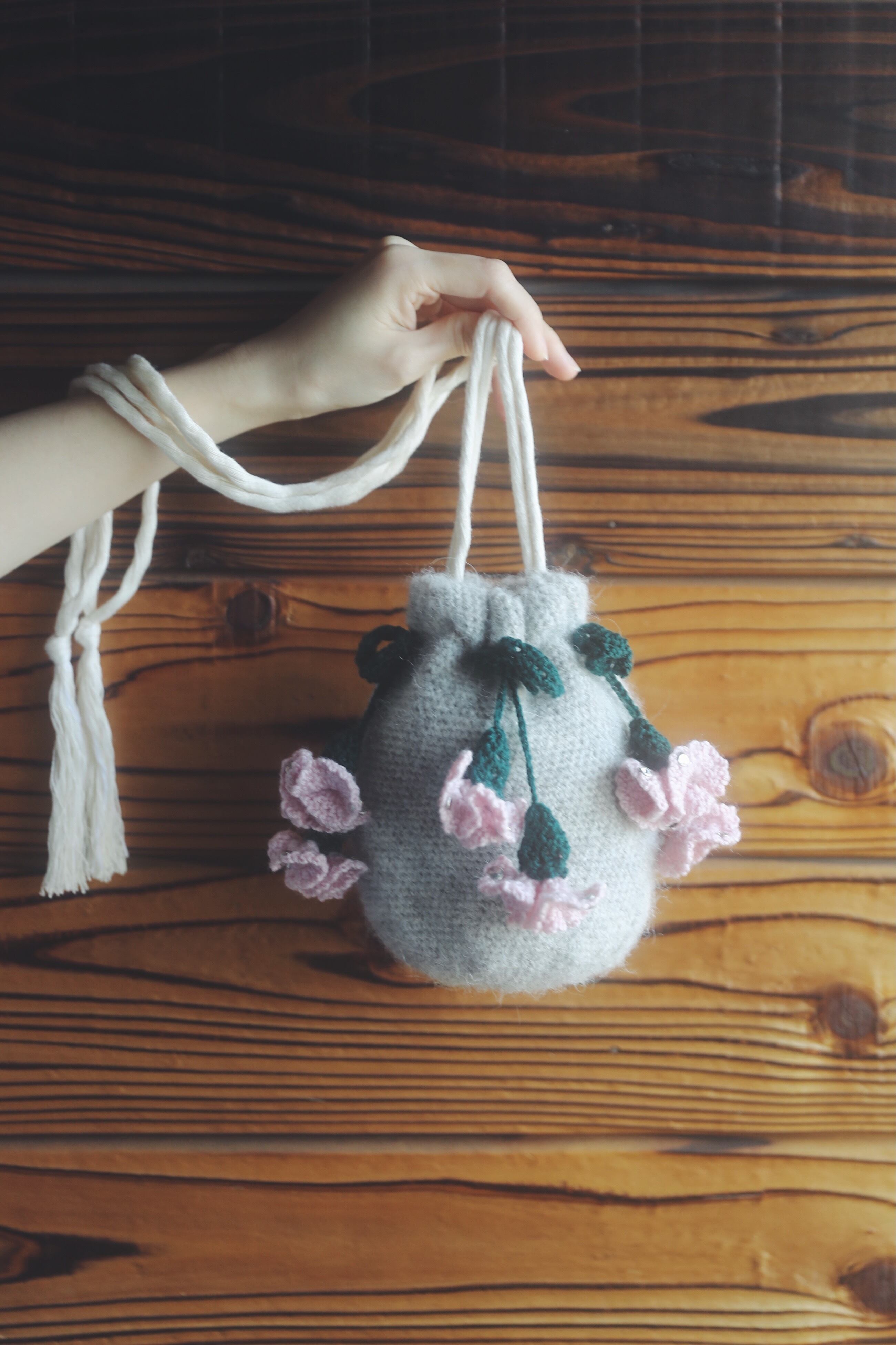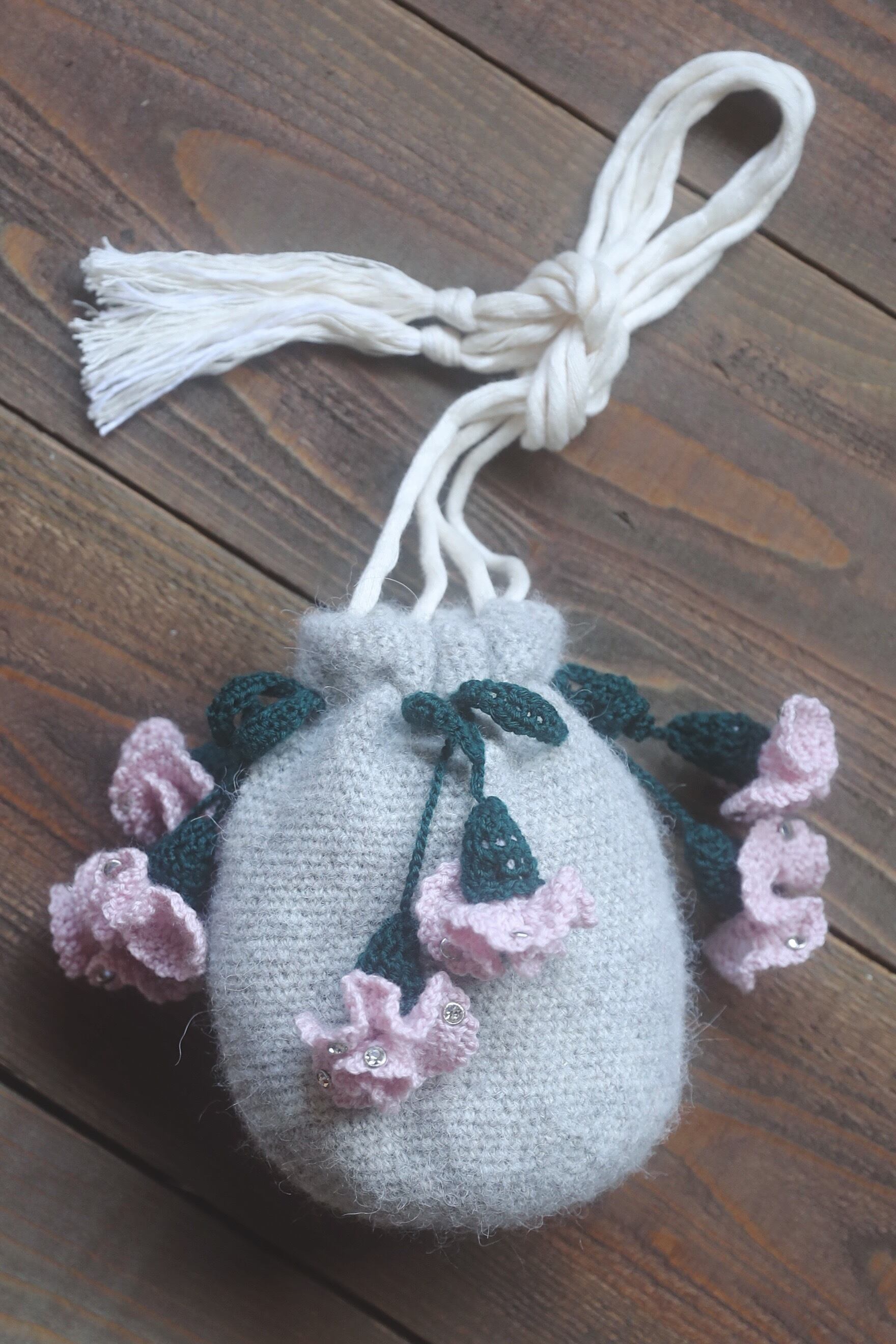 モヘア糸とウール糸で編んだニットバッグです。揺れるお花のモチーフと、さりげなく輝くスタッズが可愛らしい1点です。