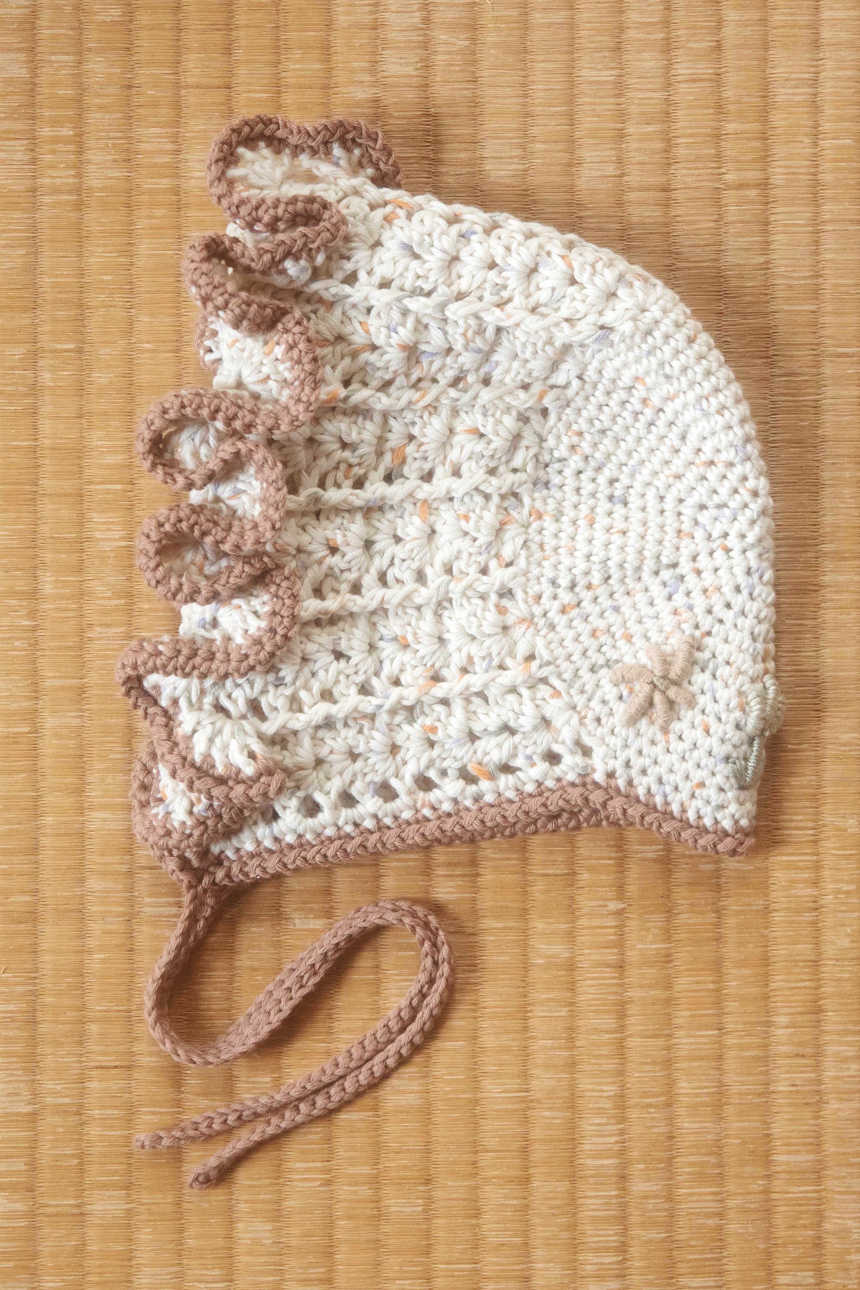 Babytoly Organic cotton yarnsを使用した、大きなフリルが可愛らしいボンネットです。後ろには、お花の刺繍を施しました。