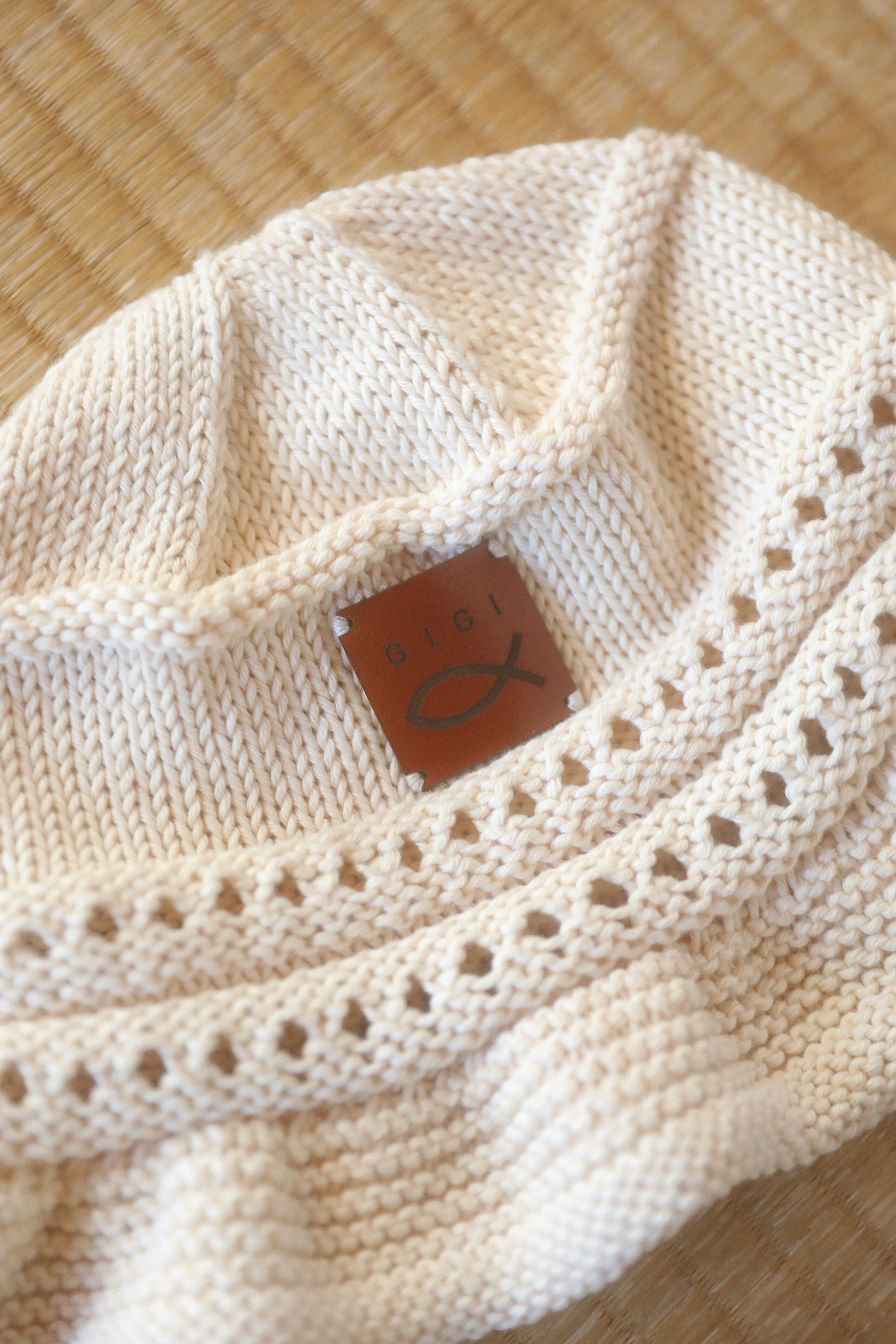 Babytoly Organic cotton yarnsを使用した、帽子です。フロントに施されたGIGIのレザータグが、コーディネートのワンポイントになるアイテム。