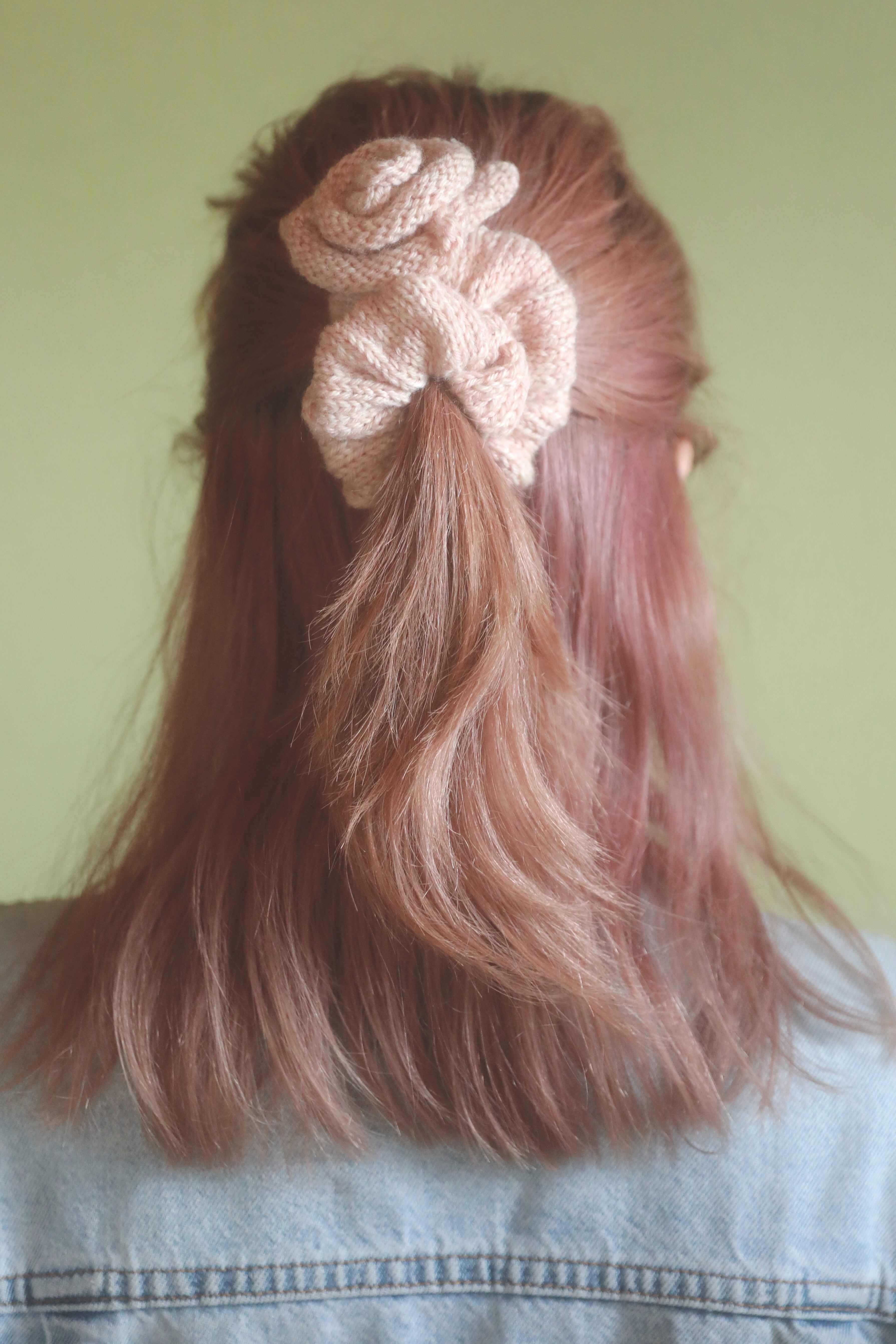 ローズモチーフが可愛い、ボリュームのあるニットシュシュです。