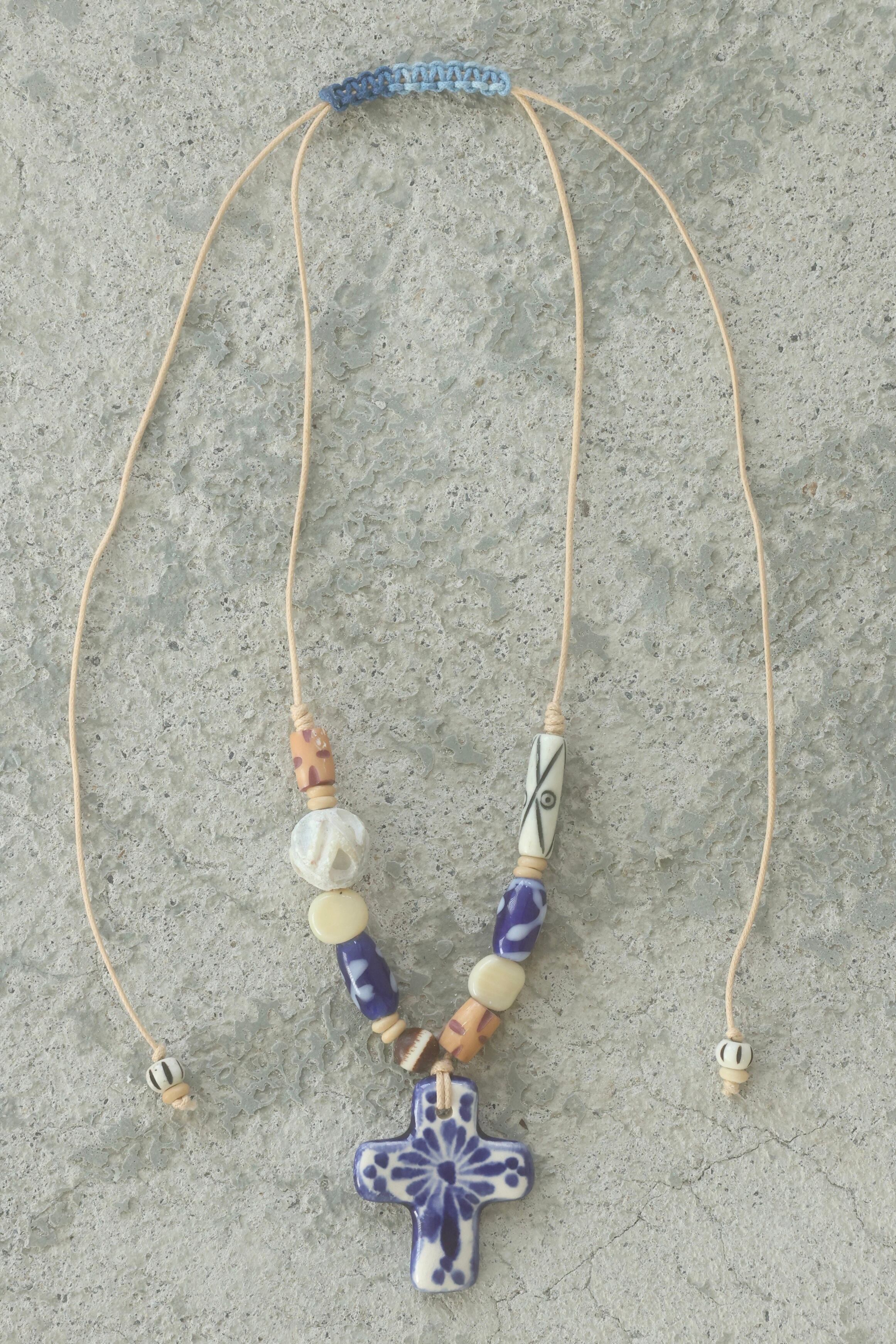 ボーンビーズ、ストーンビーズ、とんぼ玉、陶器チャームを使用したネックレスです。