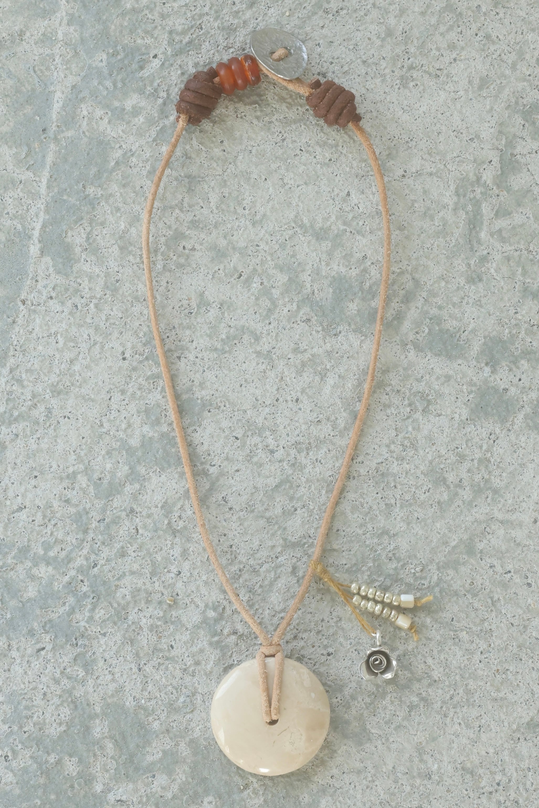 ストーンビーズ、ホーンビーズ、カレン族シルバーチャーム、レザー紐を使用したネックレスです。